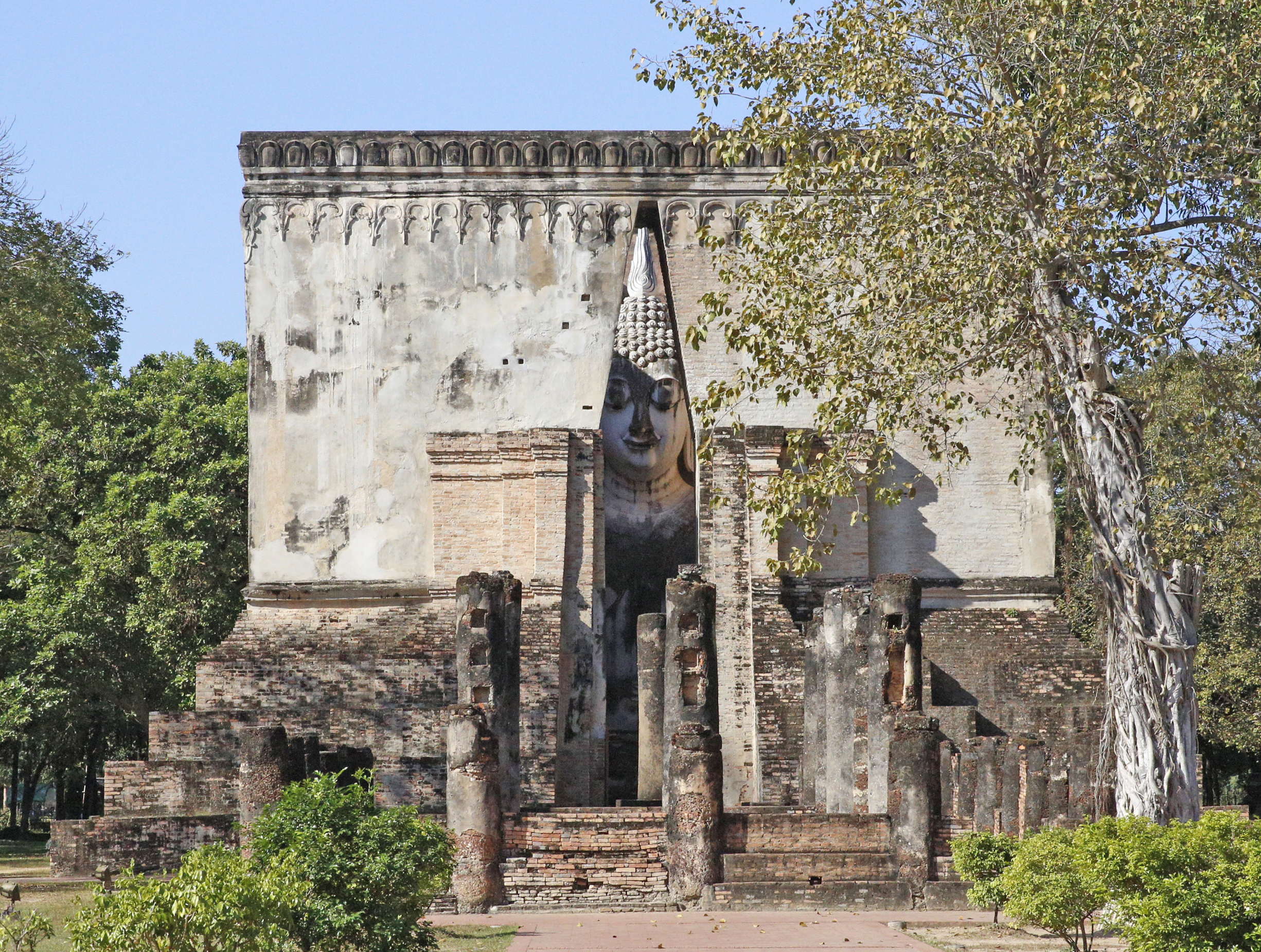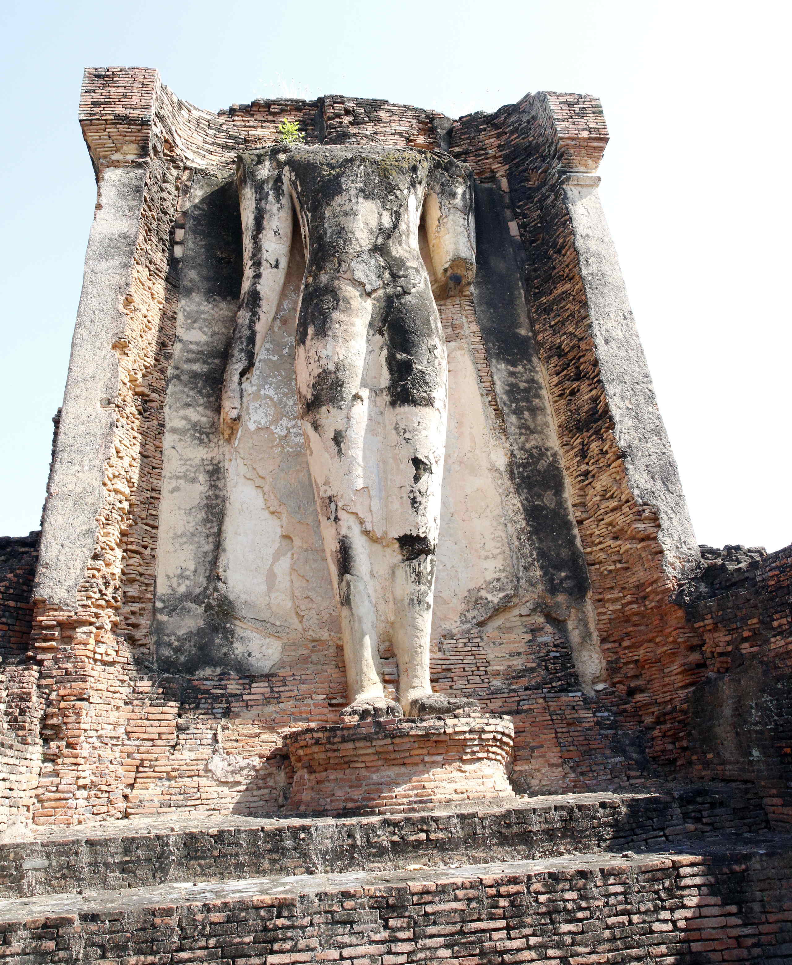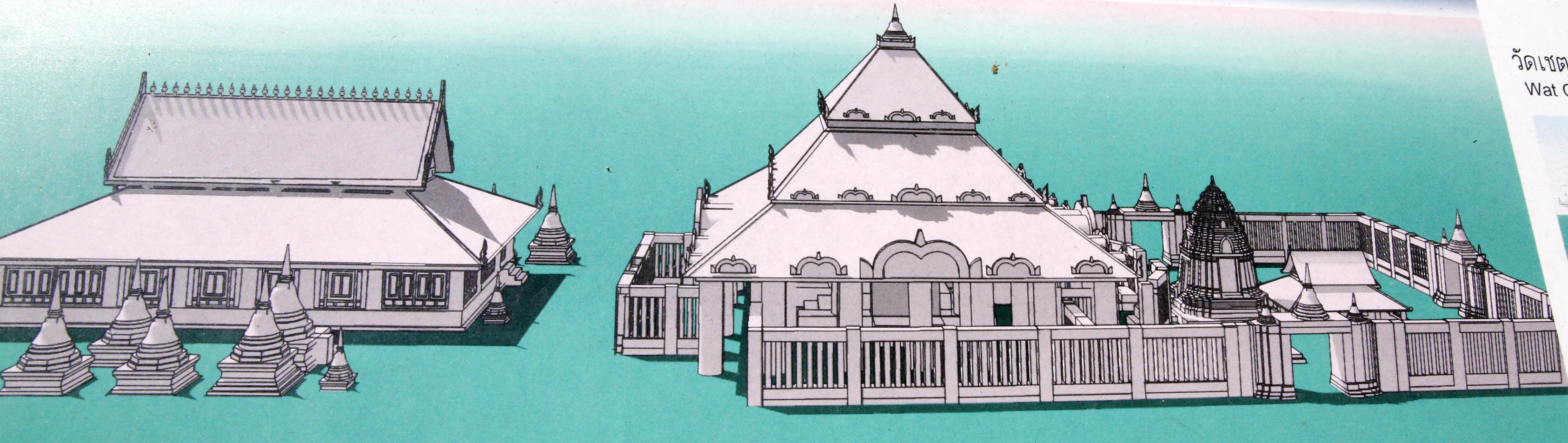 まずスコータイ時代の建物との比較であるが、スコータイの宮殿は復元図も無いので比べられない。寺院については、いくつかの寺院の建物の一部が残っており、またいくつかの寺院のところの説明板に復元図があり、また国立ラームカムヘン博物館には簡易な復元ミニチュア模型があるので、スコータイ建築のイメージは掴める。