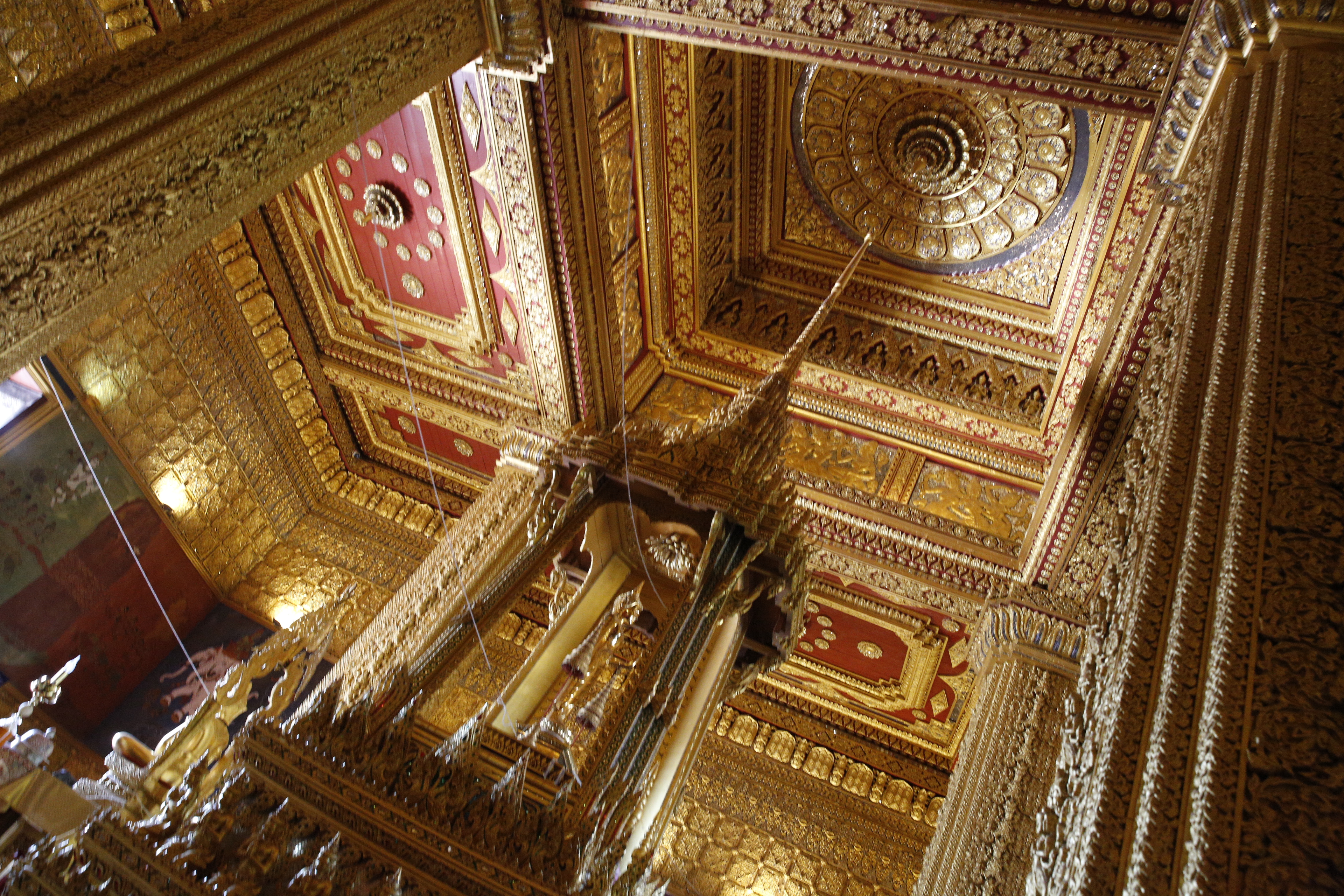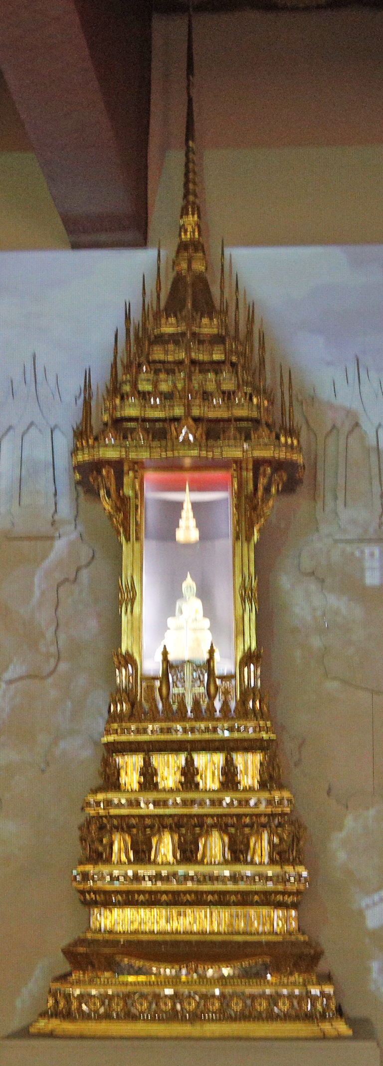 ムアンボーランで売っていた『Guide to Muang Boran fifth edition』(2001年 THe Viriyah Co.,Ltd.発行 英語版)によると、この「宮殿」は、「アユタヤ第8代王、Phra Barmatrai Lokanatプラ・バルマトライ・ローカナット?のとき建てられた」ものを復元したとのこと。その復元の正確さについてであるが、同書では「タイと外国の歴史学者によって残された、考古学的歴史的証拠に基づいて復元された。また、建物の草案を組み立てるため廃墟の調査が実施された。建物の詳細なデザインと装飾は同様に史跡と史料に基づいてなされた。」(p77)としている。しかし他方で、後世の王朝の現存のいくつもの建物を非常に参考にした旨も書かれているので、この復元の建物からアユタヤ宮殿のことについて考察し、スコータイ王朝の建物や、現チャクリー朝(ラッタナコーシン朝)の建物とを比較したり、それらのつながりを論じるのは少し無理があると思われる。まあ、それを承知の上で、この「宮殿」の様式の独自性、歴史的位置を論じてみたい。ただ、このサンペット・プラサート・パレスは、内装にも煌びやかな装飾をふんだんにほどこしていて、1972年に国王がイギリスのエリザベス女王をここで歓待したこともある。それでタイ人にとっては、ここは現在の王宮に次ぐくらいの権威のあるものとしてとらえている、ということは言えるだろう。このためか、内部の撮影はここだけ禁止されていた。私はこの豪華で美しい内部を外から撮れる範囲で撮影してしまった。