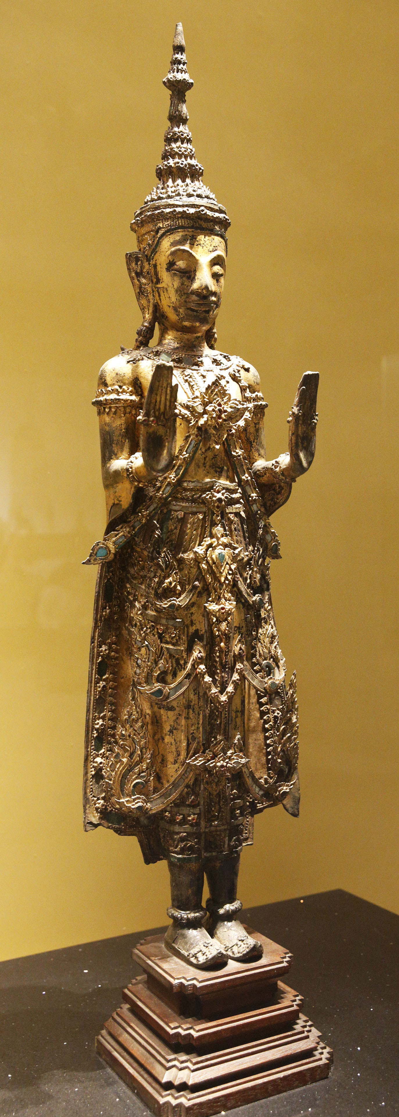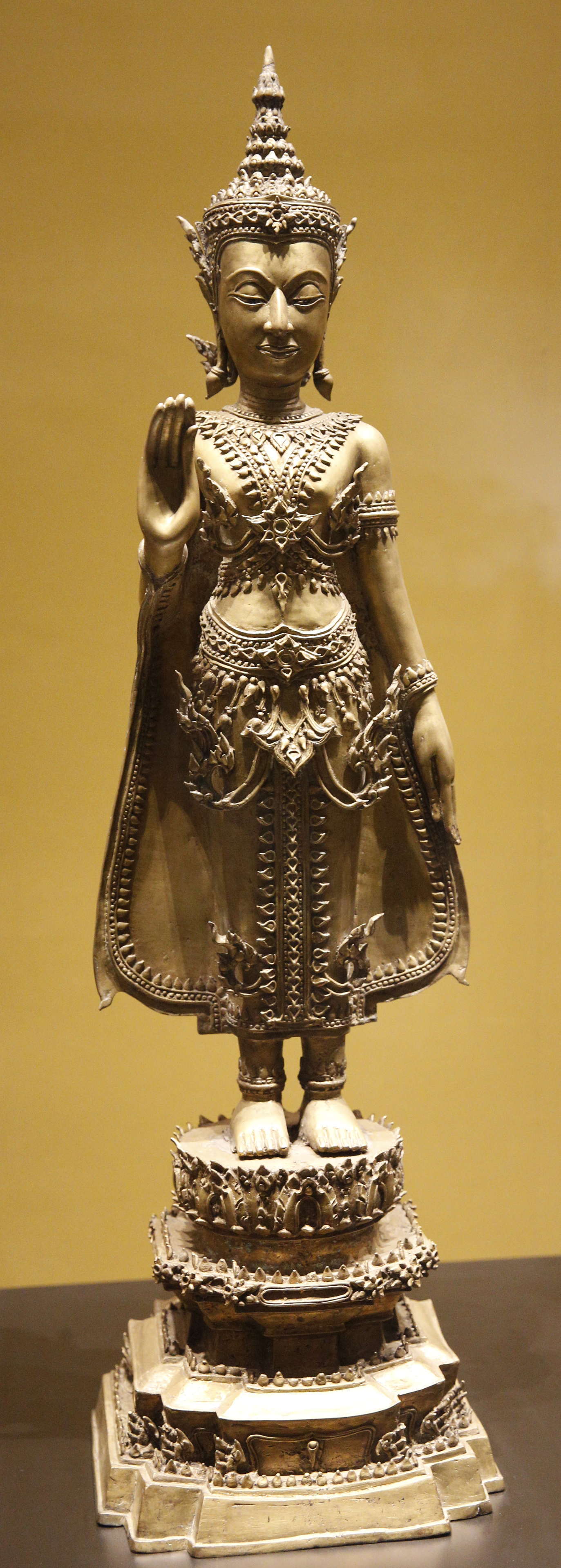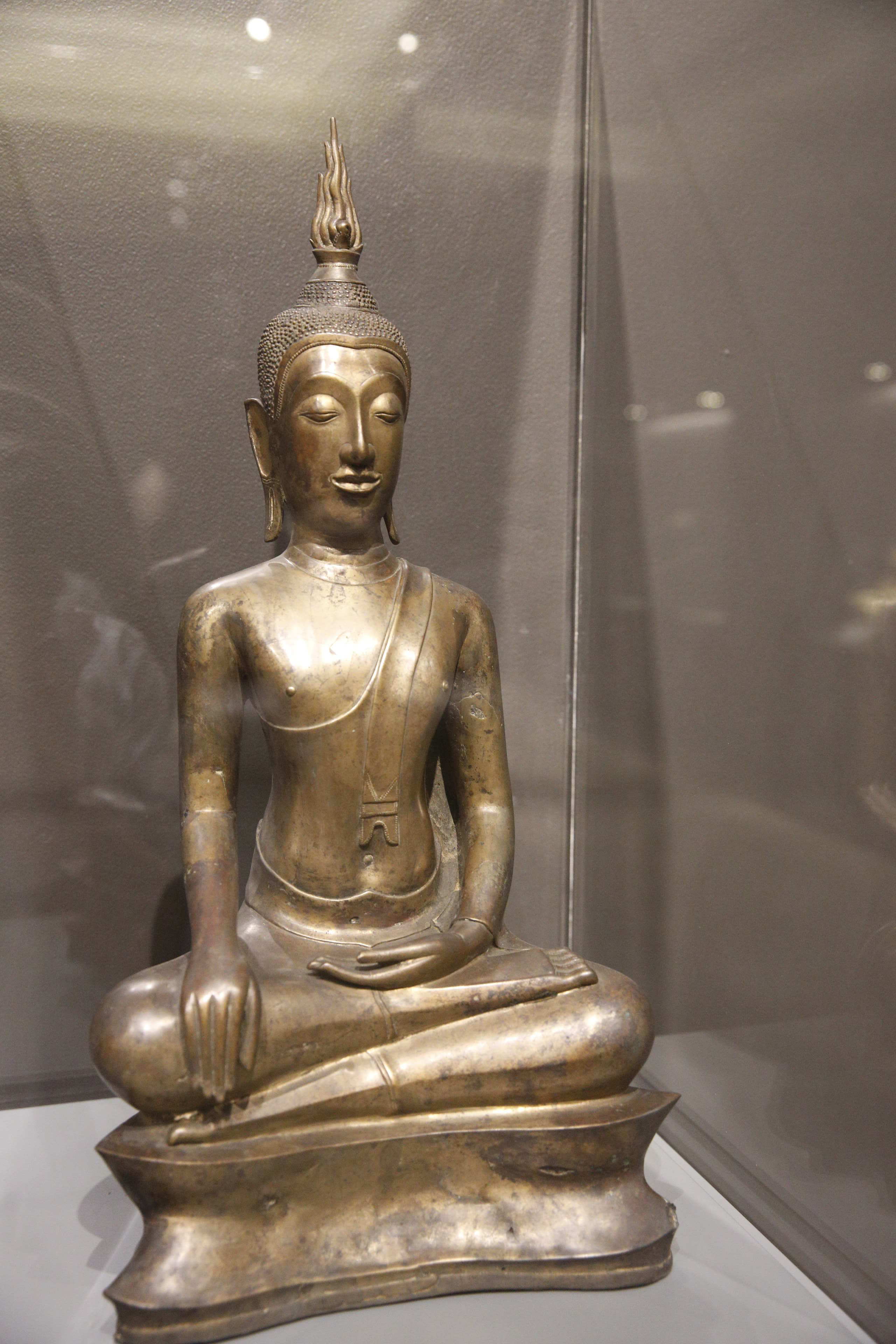 博物館でこれは見ることができる。極めて単純化していうなら、その初期はスコータイの仏像の継承、悪く言えば模倣で、頭からの炎の形の発光なとにそれが見られる。やがて温和だったスコータイの表情から堅い表情に変わっていき、シャカに宝冠や豪華な衣服を着せた仏像が現れてくるる。スコータイに比べて交易でより経済的に繁栄したことを背景としたためでであろうか? 下に示すものはいずれもバンコク国立博物館展示のものである。