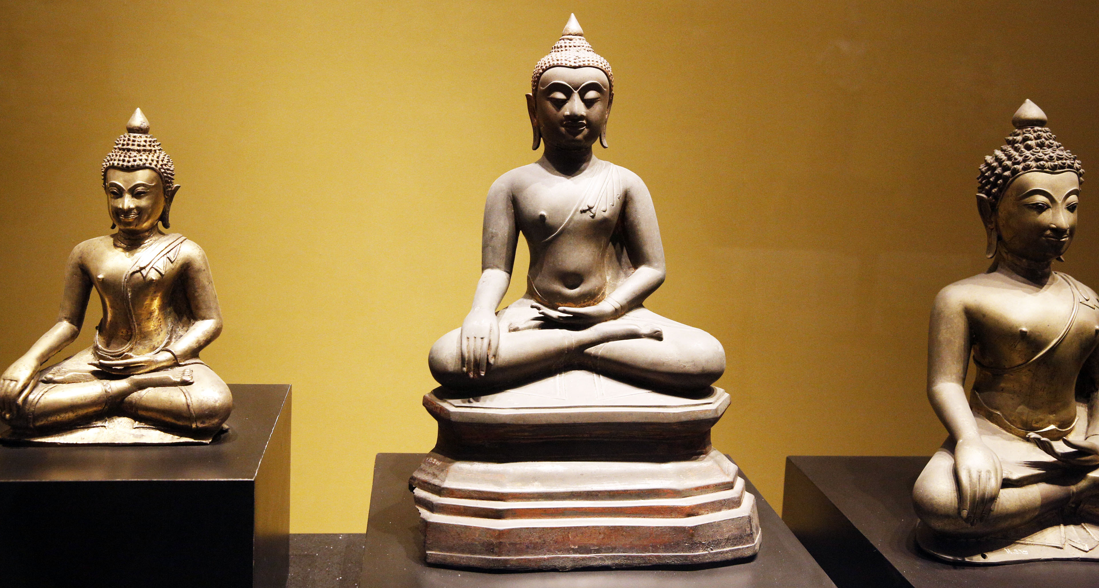 アユタヤ王朝初めのころのもの。頭からの炎の形の発光などスコータイ様式を模倣。ただ、左は顔が細面、右はブッダの表情が少しスコータイのものと違う。