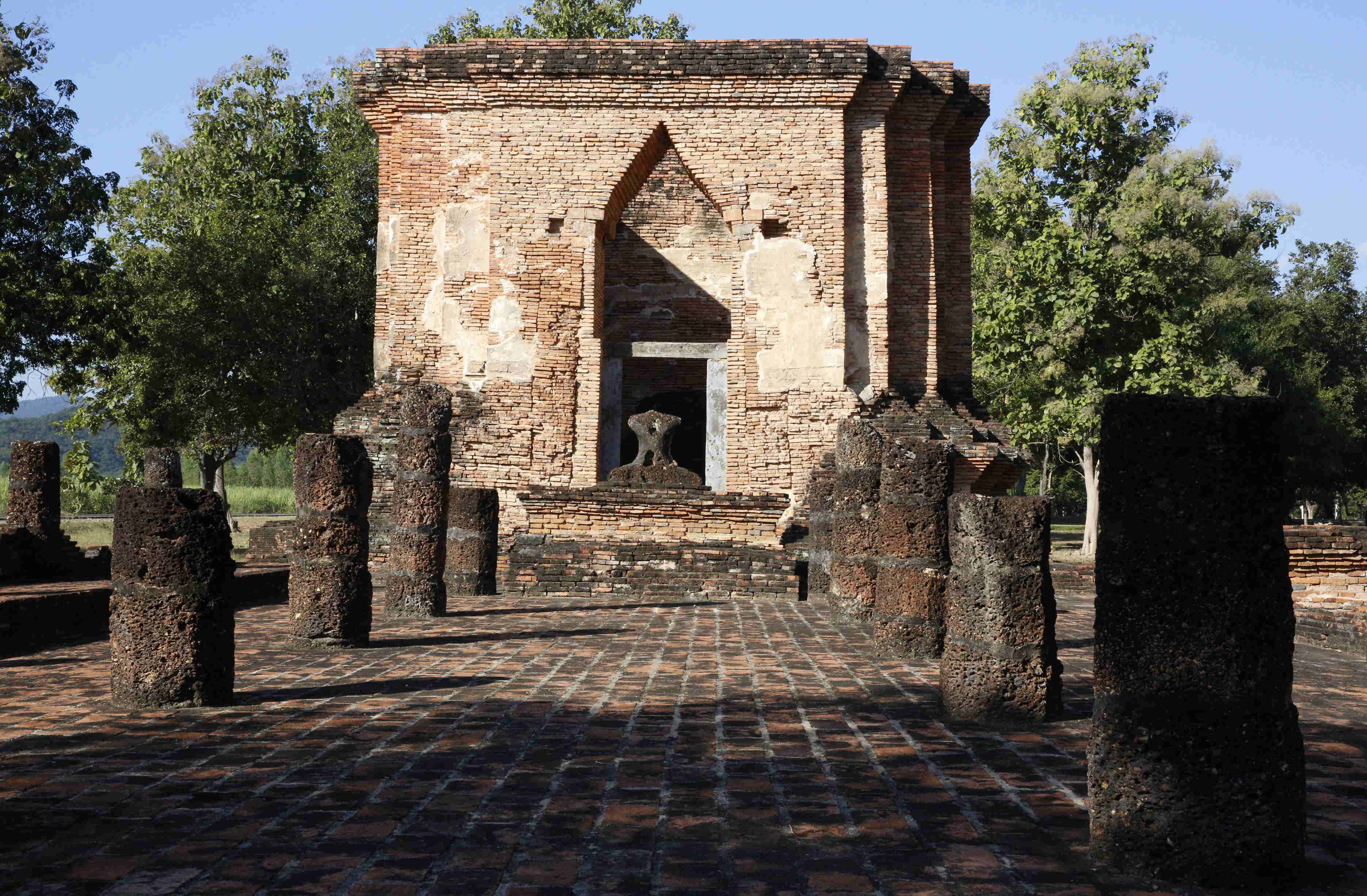 ワット・トラパーン・トーン・ランは四面に壁龕があり仏像が置かれていた。これもスコタイ様式の特徴とか。復元図の掲示板もある。この建物に段の付いた四角錐(ピラミッド形)の屋根があった。また切妻屋根を上にする二段の屋根を持つ、吹きさらしのお堂が付いていた。