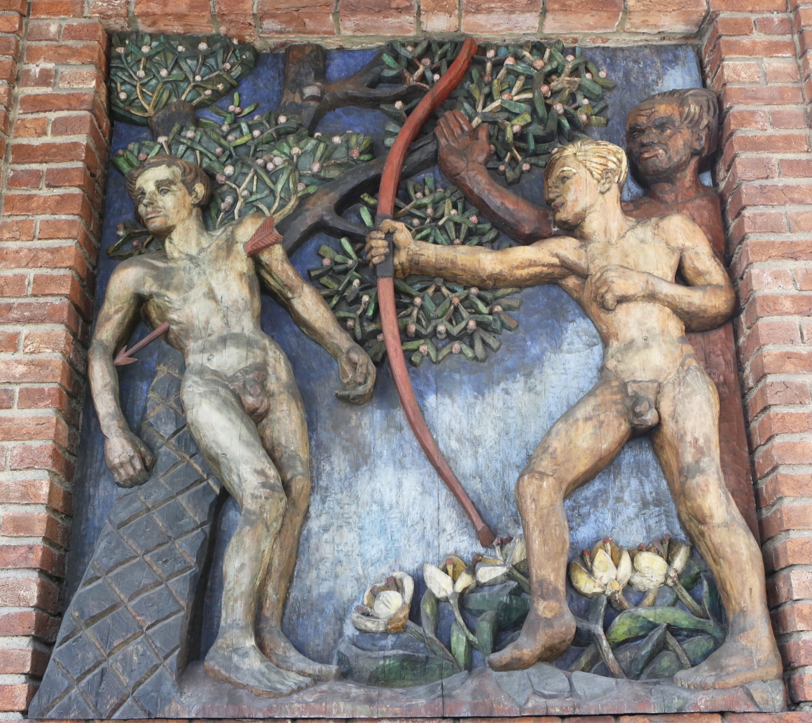 説明パネルには「巨人たちは神々と常に戦っている。ロキは巨人の血統だが、オーディンの義兄弟である。彼は邪悪でずる賢く、神バルドルの死を間接的にもたらす1神である。他の神々は、何もバルドルを傷つけなくて安全だと信じて、楽しんでバルドルに向かって射かける。バルドルの異母兄弟で目が不自由だが強いヘズは、ロキに『バルドルに同じ敬意を示そう』と欺かれる。ロキはヘズに宿り木でできた矢を渡し、バルドルを狙うよう助ける。こうしてヘズは兄弟の殺し屋となった。」とある。ロキは、『ギュルヴィたぶらかし』33で、「巨人ファールバウティの息子」「容貌は美しいのだが、性質はひねくれていて、・・悪知恵にかけては誰にもひけをとらず、何事にもずるい手だてを心得ていた。」と描写されている(p248)。『古エッダ』「ロキの口論」[9]で、「オーディン、・・昔、おれたち二人が血をまぜた・・。」(p81)とある。これは、谷口幸男氏の訳注(2)によると、「古代の風習で、友が互いに血盟を誓うとき、傷つけた傷口から流れる血をその足跡に流し込んだ。」(p87)という意味だそうで、これがパネルでは「義兄弟」とされている。ヘズがバルドルを射ることは『古エッダ』「巫女の予言」[32]と「バルドル」[9]にあり、ロキがヘズを唆すことは『ギュルヴィたぶらかし』49に詳しい。このフリーズで、矢を射ているのがヘズで、その後ろにいるのがロキであろう。この後、バルドルの弟ヴァーリがヘズに復讐する(「バルドルの夢」[11])。バルドルの死体は荼毘にふされる。バルドルの他の兄弟ヘルモーズはフリッグの要請で死者の世界ニヴルヘルに行き、バルドルを返してくれるよう頼む。ニヴルヘルの女王ヘルが「もし世界中のものがバルドルのために泣くなら戻す。」と応えたので、神々は四方八方に使者を送り、人間から石や木まであらゆるものに泣いてもらう。しかし、ある洞窟にいた女巨人だけが拒んだため、バルドルは蘇らなかった。この巨人は実はロキが化けたものだった。怒った神々はロキとその子たちを捕らえ、兄を狼に変え、弟を引き裂かせた。そして、その死体から腸を取り出してロキを岩に縛りつけ、毒がロキの顔に滴るようにロキの頭上に毒蛇を置いた(この世の地震は、毒が滴るとロキがもがくので大地が震えて起きるとされる)(以上のことは、『ギュルヴィたぶらかし』49、50にリアルに描かれている)。