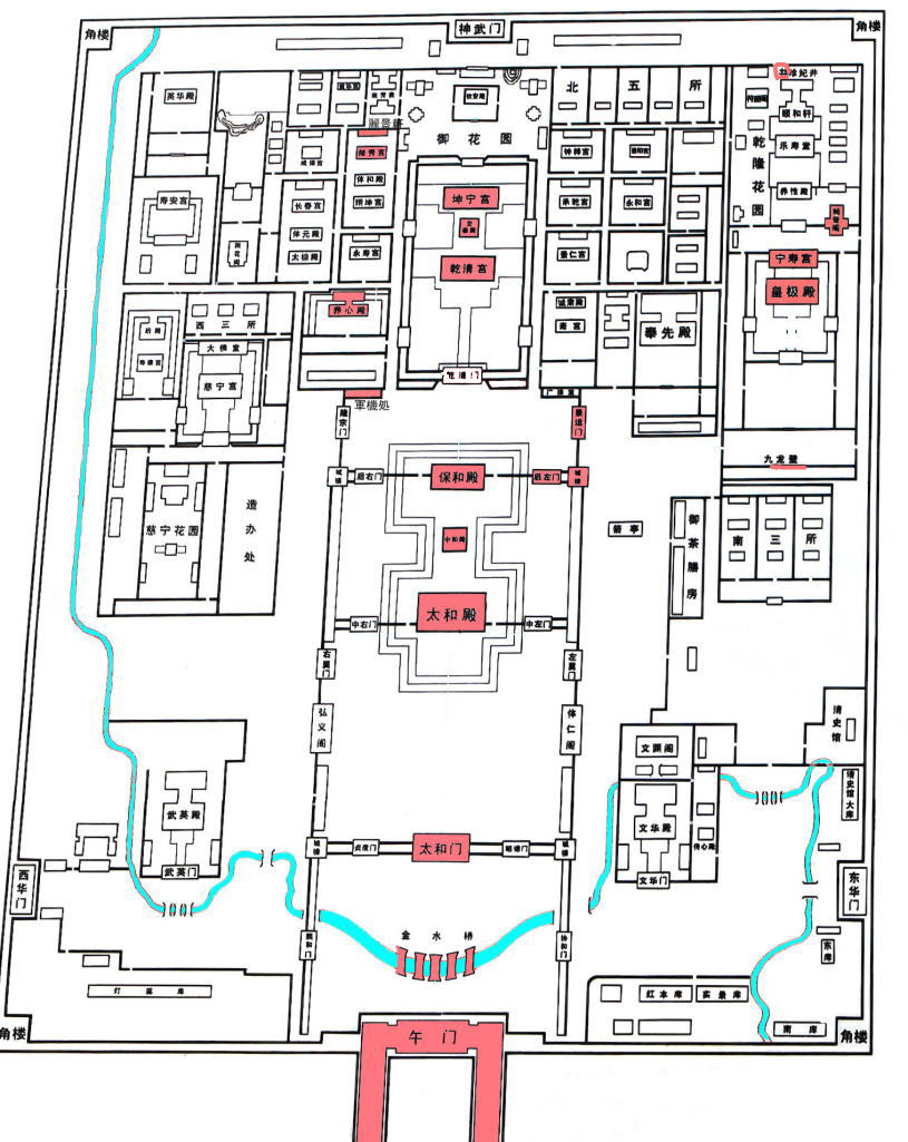 第3代皇帝順治帝は、明に仕えていた呉三桂(ごさんけい)将軍の手引きにより、万里の長城内に入り、現在の北京に、遷都した。明の都を引き継いだ形となった。明代に作られた紫禁城が、末期の混乱で破壊されたのを、ほぼ同じように再建した。北京は、おおまかに言って、西、北、東が山地であり、北西から東南へ流れる永定河(えいていが)の扇状地として形成され、また南へ流れる潮白河(ちょうはくが)もあり、古くから北方民族に対する防衛拠点として重要視されてきた。西、北、東の三方向に行く道路が交わる交通の要衝でもあった。春秋戦国時代には燕(えん)国の首都となり薊(けい)と称された。その後、遼王朝がここを副都とし、金王朝が首都とした。モンゴルの元王朝が現在の紫禁城とほぼ同じ場所に宮都を建築し、1272年「大都(だいと)」として都の一つとした。元を滅ぼした明により、大都の宮都は破壊されたが、第3代皇帝の永楽帝(えいらくてい)が、1406年この地を「北京」と改名して都とし、420年に現在の原型の紫禁城を完成させた。「紫」とは、天帝のすみかである、北極星を中心とした「紫微垣(しびえん)」から来ている。「中国皇帝は単なる中国の支配者ではなく、この全地上の支配を天帝から委ねられている。」という思想から、皇帝の宮殿の名も天帝にあやかった。「禁」は、庶民が入れない「禁地」の意味である。「かつての宮殿」という意味で「故宮」とも言われている。下に現在の全体の平面図を示します。ピンク色のところをクリックすると、それぞれのところが写真とともに簡単な解説で見られます。