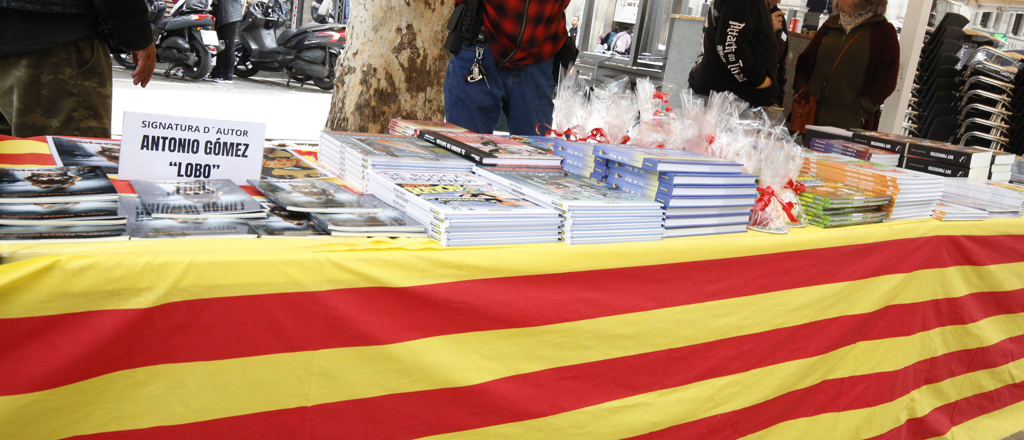 何という幸運! バルセロナ2日目は4月23日で、この日は年1回の「サン・ジョルディ(聖ゲオルギウス)の日」として独自の行事が行われ、それを見ることができた。これはカタルーニャ全域でも行われている行事で、カタルーニャの独自性を示す一つである。聖ゲオルギウスはバルセロナの守護聖人の1人で、3世紀後半に生まれ、、伝説として、動物を食べ続け次はある国の王女を食べようとしていた龍を、その口に剣を指して仕留めたという。その龍の流した血から赤い薔薇を作って助けた王女にプレゼントしたという。彼は4月23日に殉教したとされ、この日、人々は赤い薔薇の花など、花を親しい男女に贈るという。また、この日は偶然にも、セルバンテスとシェイクスピアの命日でもあり、人々は赤い薔薇の他、カタルーニャ語の本も親しい人に贈るのである。バルセロナの中心部のランブラス大通りなどには朝早くから赤い薔薇を売る出店や、本を売る出店が立ち並んで、多くの人々がそれらを買い求めていた。そして、店の陳列台を黄金地に赤線の入ったカタルーニャの州旗が取り巻いていた。