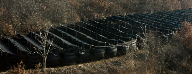 ビニールハウス以外に畑で目についたのは、なにやら斜めに黒いビニールに覆われたもの。これが韓国名産朝鮮人参の栽培場所だ。弱い光を好むため、北側だけを開けて光の量を調整する。収穫は種を播いてから4年から7年だという。 車窓からなのですこしぶれていてお見苦しい。中もよく見えなかった。 韓国スケッチへ 9カ国のスケッチへ トップページへ