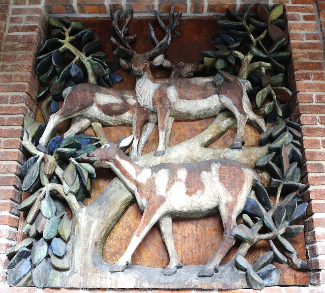 説明パネルには「ダーイン、ドヴァリン、ドゥネイル、ドゥラスロールの4頭の鹿が世界樹ユグドラシルの緑の若芽を食べている。それらのうち3頭が、『安心、用心深さ、臆病』のシンボルとしてここに描かれている。」とある。