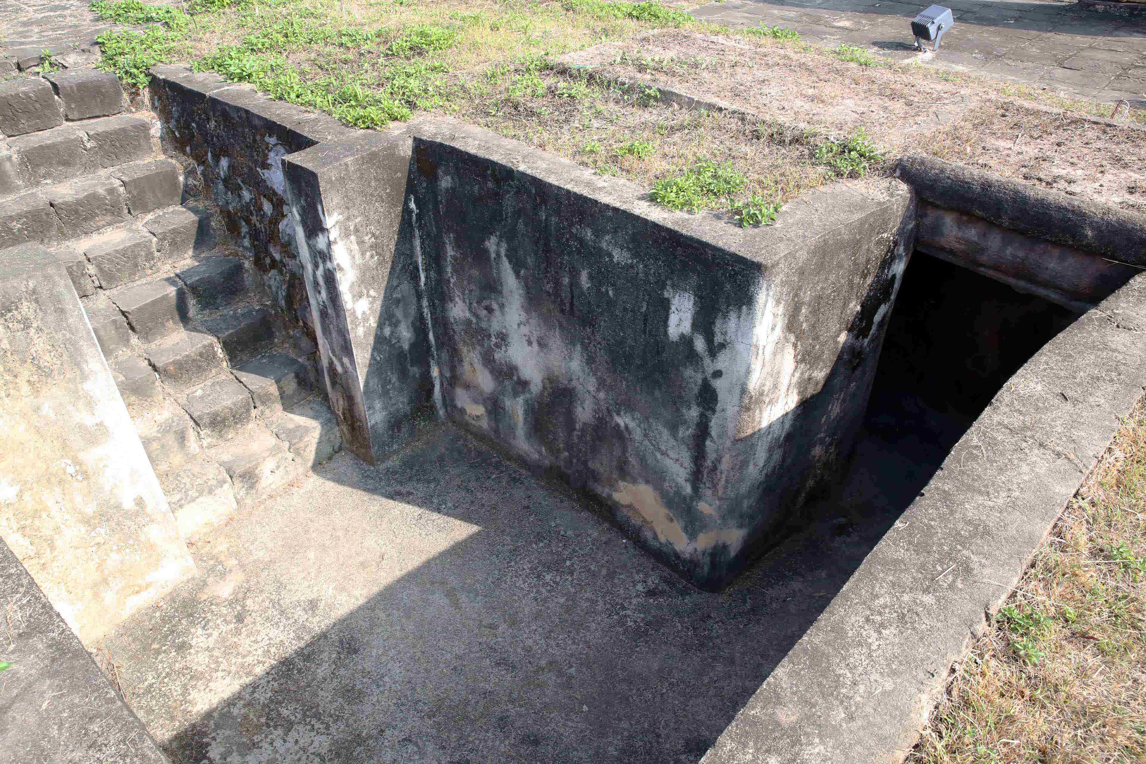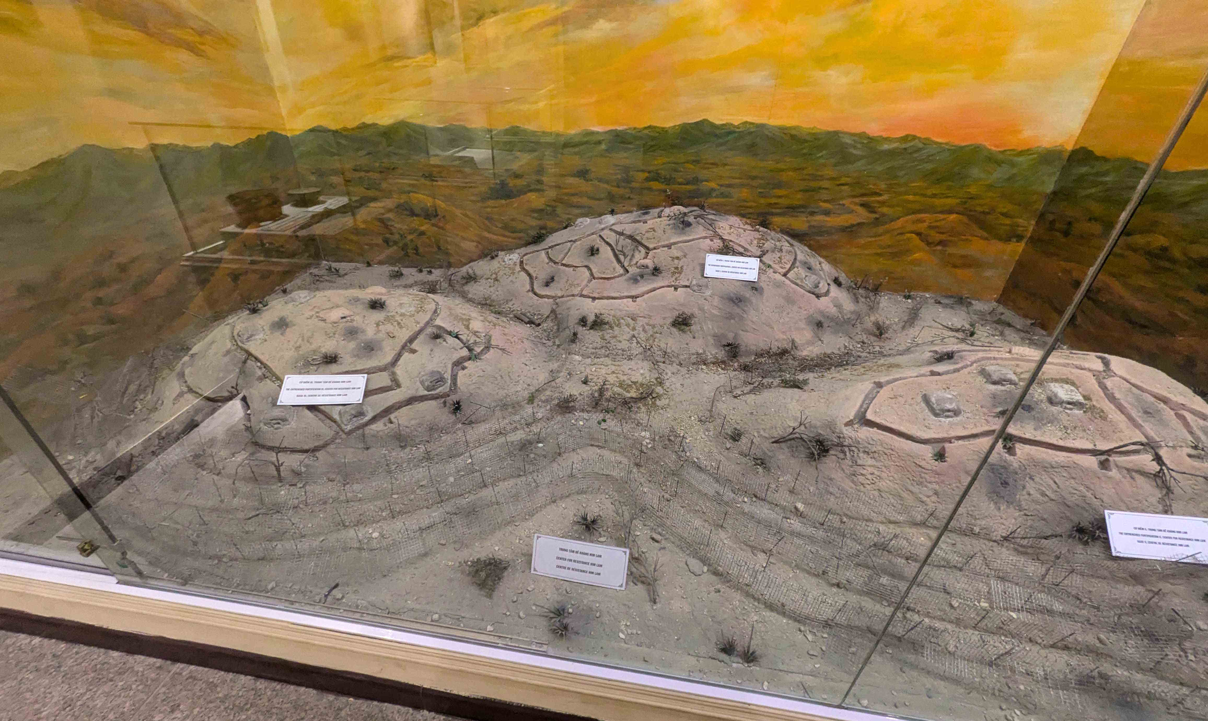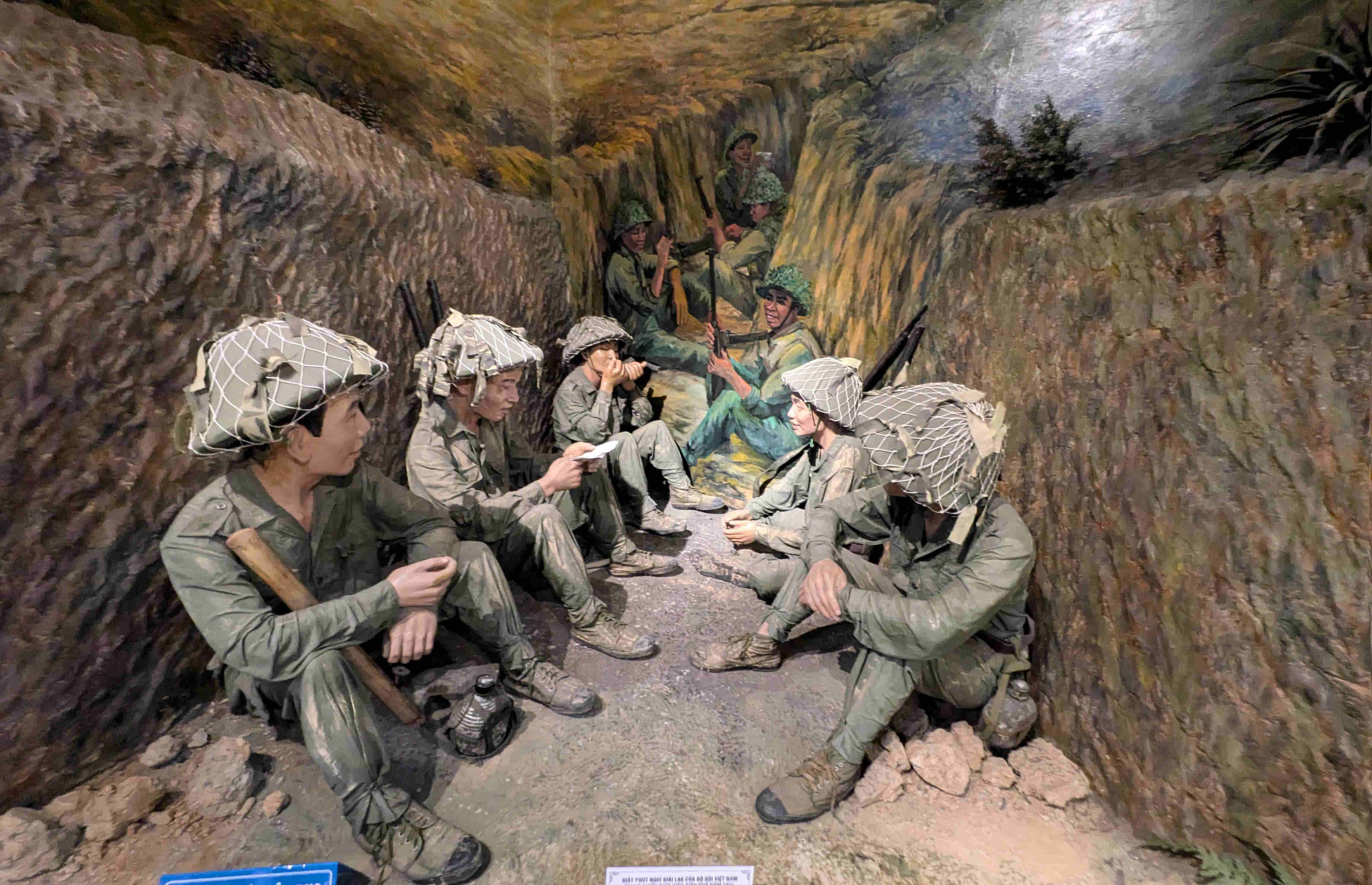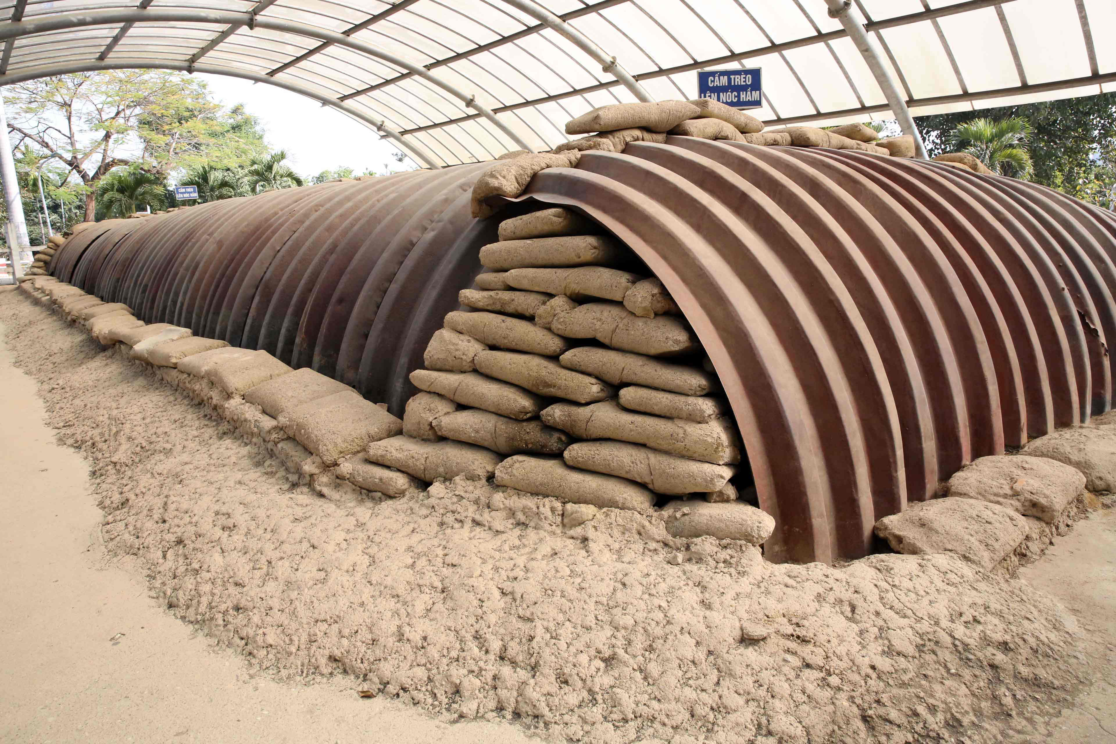 司令部は、塹壕の中に、土嚢で壁や天井を覆い、さらに天井に鉄板を敷き、加えて外には蒲鉾型に鉄板を被せて防御を固めていた。上のプラスチックの覆いは展示を守るため後にベトナムによって架けられたもの。