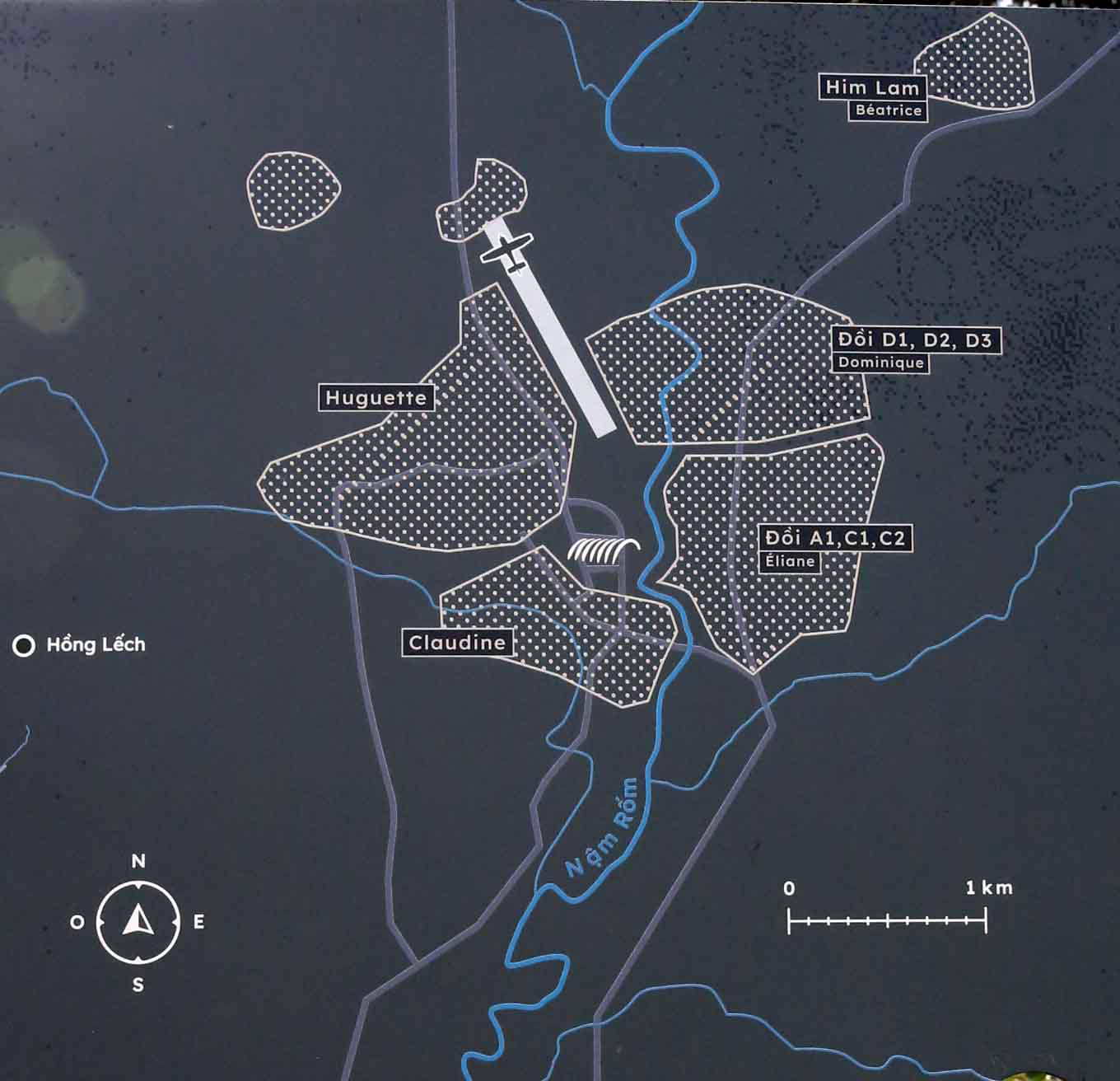 ベトナム共和国軍は、砲撃による攻撃とともに、塹壕を掘ってフランス軍陣地に近づき、爆破したり、白兵戦で一つ一つ9つあったフランス軍陣地を破壊していった。現在、そのうち5月7日未明に陥落したA1陣地の跡が整備されて史跡として公開されている。