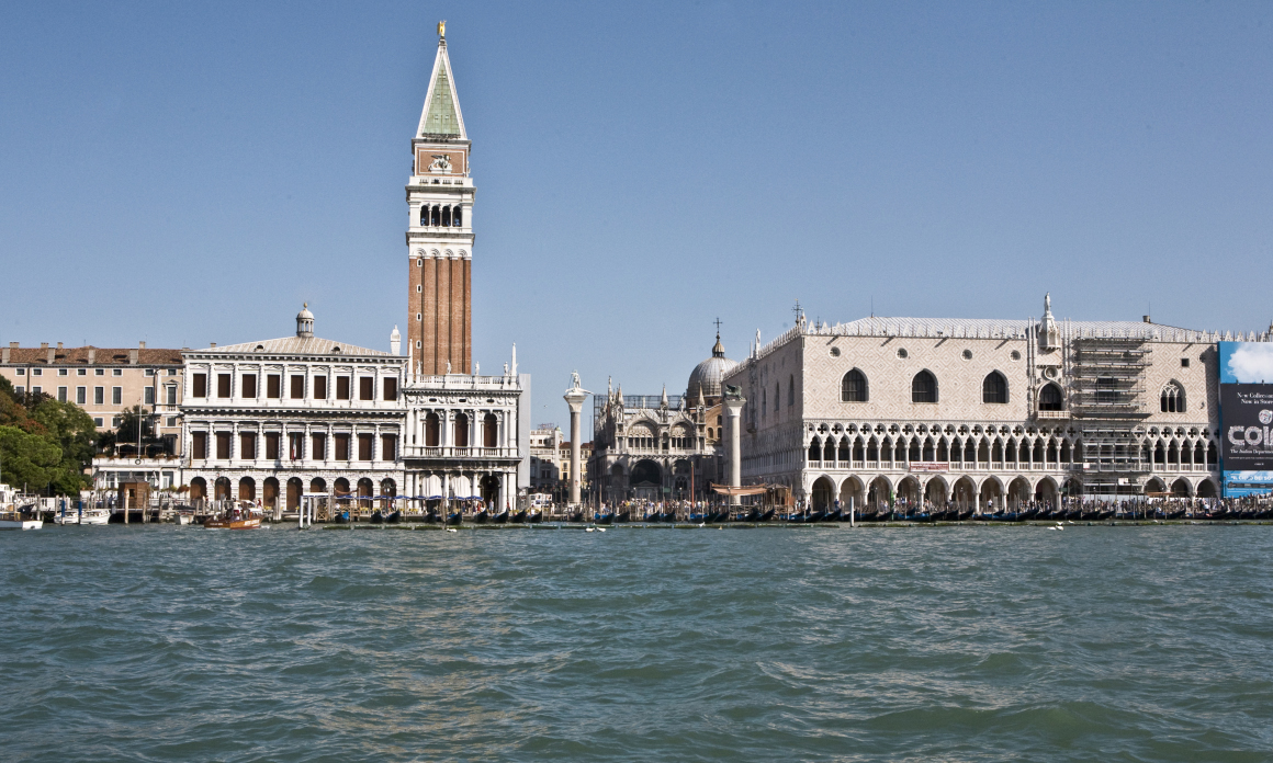正面右手前がドゥカーレ宮殿。その奥のドームがサン・マルコ寺院。その鐘楼は高さ96.8m。