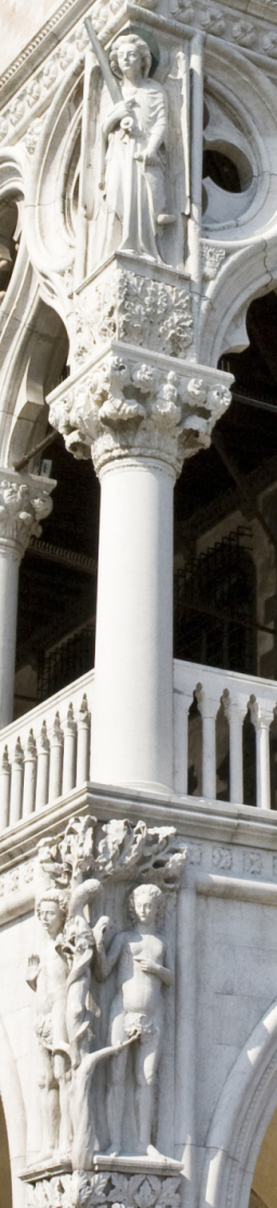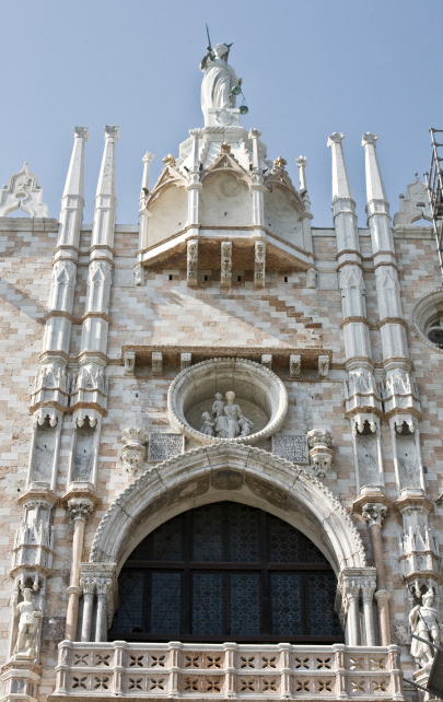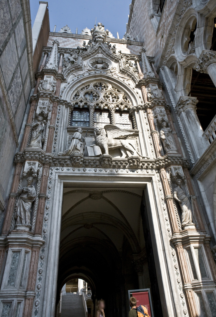 西側の最も北の部分に、入り口であった「ポルタ・デッラ・カルタ」(「紙の門」)がある。記録や資料がこの宮殿で管理されていたことにちなむとか。上に、聖マルコ(有翼ライオン)にひざまずく、この門が当初作られた時のドージェ、フランチェスコ・フォスカリ(在任1423〜57)の像がある。上部にはここにも正義の女神像。ここから中に入ると、ドージェが就任の時儀式で使った「巨人の階段」がある。私は、内部の撮影とWebページへの掲載を特別に許可され、この門で手続きをして中に入った。そのいくつかは次のページで紹介します。