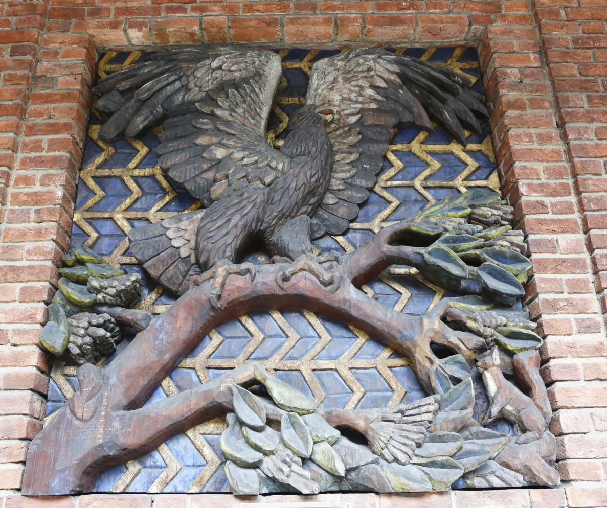 説明パネルには「ユグドラシルの枝の高いところに力強い鷲が1羽いて、遠くまで回りを見渡し、その大きな翼を羽ばたいている。小さな栗鼠(りす)ラタトスクが、野獣ニーズヘグ(敵意と悪意をもって切るもの)に鷲の言葉を運んで伝えるため幹を駆け下りている。ニーズヘグは世界樹の根をかじっている。」とある。