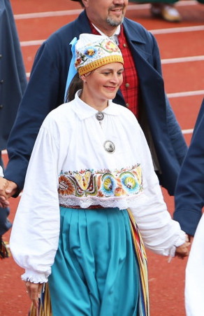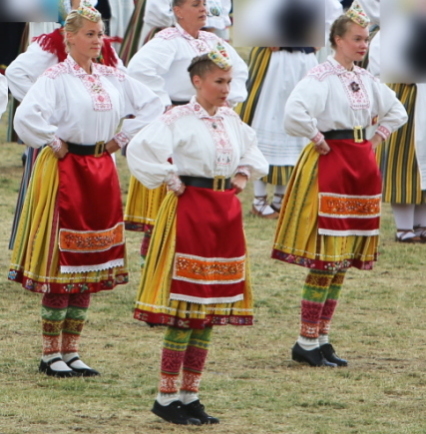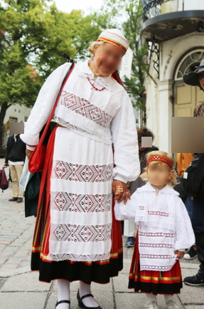 それは、エストニア女性の民族衣装については、島部など一部の地域を除いて、未婚者と既婚者で大きな違いがあるということ。頭に被り物をし、エプロンを付けるのは既婚女性に限られるということである。未婚女性は冬でも被り物をせず、ヘアーバンドのみということ。私が鉢巻だと思ったのはヘアーバンドの一種だった。エプロンをしない既婚女性は、農場の大地の肥沃さにダメージを与えるとのこと。(https://slideplayer.com/slide/3784272/Slide player Estonian folk costume より)