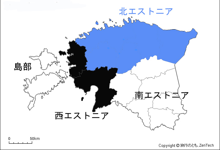 4つの地域分類は下の地図のようになる。キフヌ島は、行政的には西エストニアのPärnu県に属すが、Eesti Rahvarõivadのウェブサイトは「島嶼部」として扱っている。国立博物館の展示ではキフヌ島は、全体の「展示例」として特に地域を指定されていなかった。