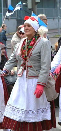 西エストニアでは、「羊毛製の茶色や黒色の上着が一般に普及しており、女性はその下に長袖シャツを着用し、三角に折ったスカーフを肩にかけた。この地域では、ほとんど教区ごとに、形状、色、装飾の異なるボンネット風の帽子がみられる。」(同書p256)