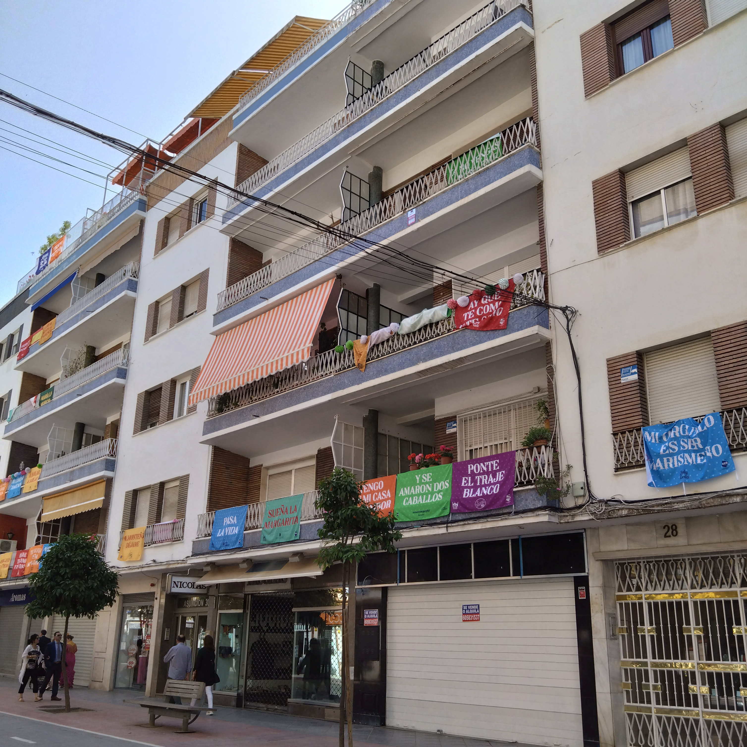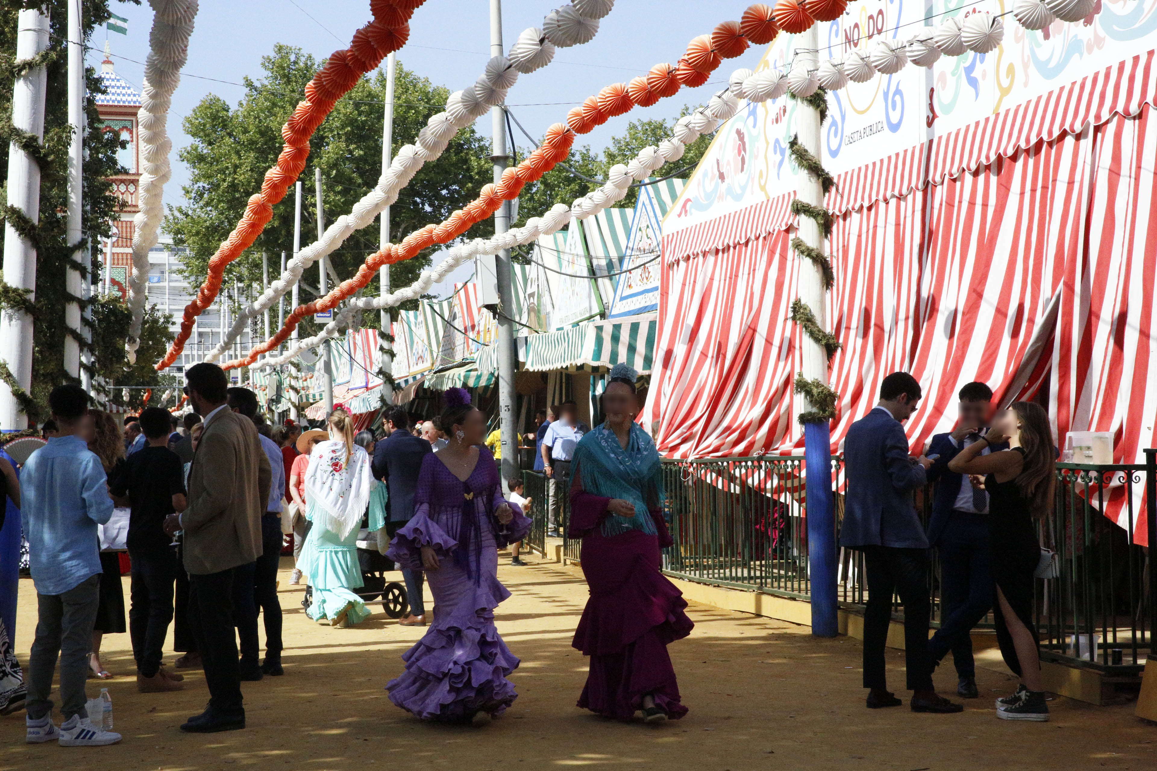 ホテルのフロントで場所を聞くと「ここから歩いて30分くらい」と言われたが、セビーリャの地図を見ると迷路の集大成の様に思えて、「絶対これは迷う」と考え、一番間違いのない川沿いの道を進むことにした。この日はおそらく30℃近くになったと思われ、私は迷わなかったものの、かなりの遠回りになったため、結局、1時間以上炎天下を歩くこととなった。ホテルの前のタクシーに乗ることも考えたが、帰りは込み合ってタクシーを拾えないだろうと思い、歩いて迷わず帰るためにも間違いのない道を行くことにしたのだった。今回失敗したのは、過去の祭りの写真を見ると、男性もネクタイをしたりして着飾っているため、私もジャケットを着て革靴を履いて歩いたことだった。現地に着いたらネクタイをしようと用意もしていった。しかし、会場で分ったことだが、そこまでフラメンカで装った「彼女」を連れて行く男性がそのように正装するのであって、1人で行く私には意味がなく、ジャケットを着て汗をだらだらかいたばかりか、後で書くように新品の革靴はとんでもないことに遭遇したのである。上の地図の会場から見て北東の橋を渡ると、着飾った美しい女性たちがたくさん一定の方向に歩いていて、もうこれで会場に来たのも同然。回りを見渡すゆとりが出てきた。通りの両側のアパートの各階のベランダには、祝賀ムードを盛り上げるために一役かうように、おそらくはカセタのグループに関するものであろう旗などがあちこち掲示され、華やかな気分を醸し出していた。