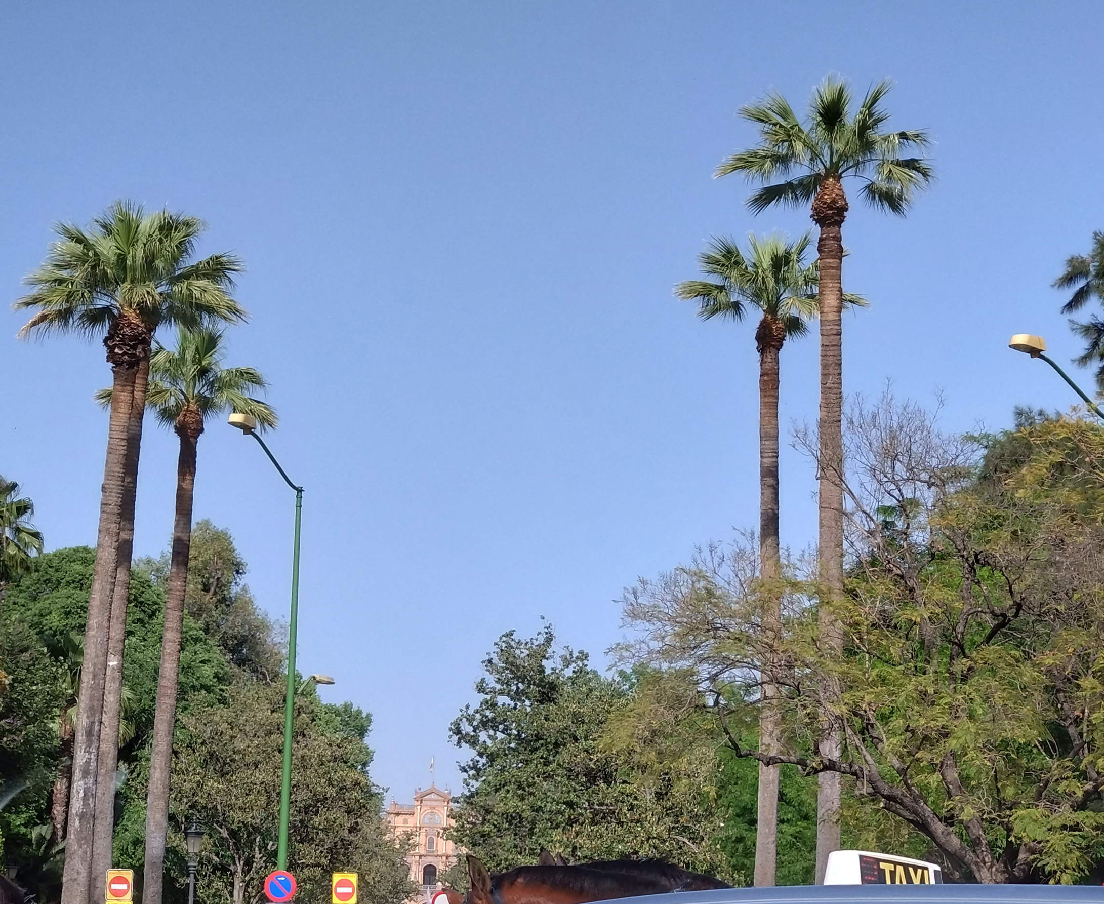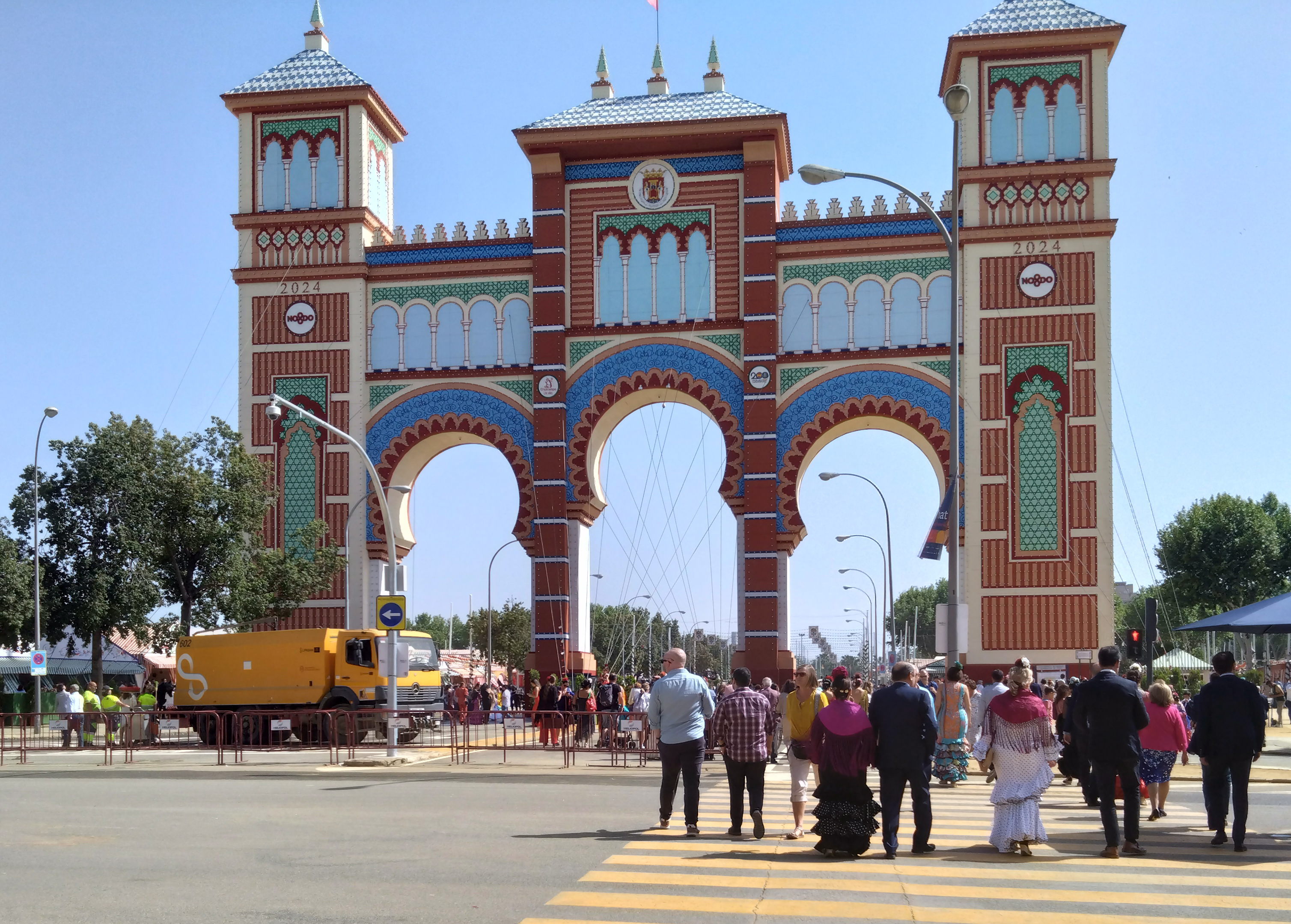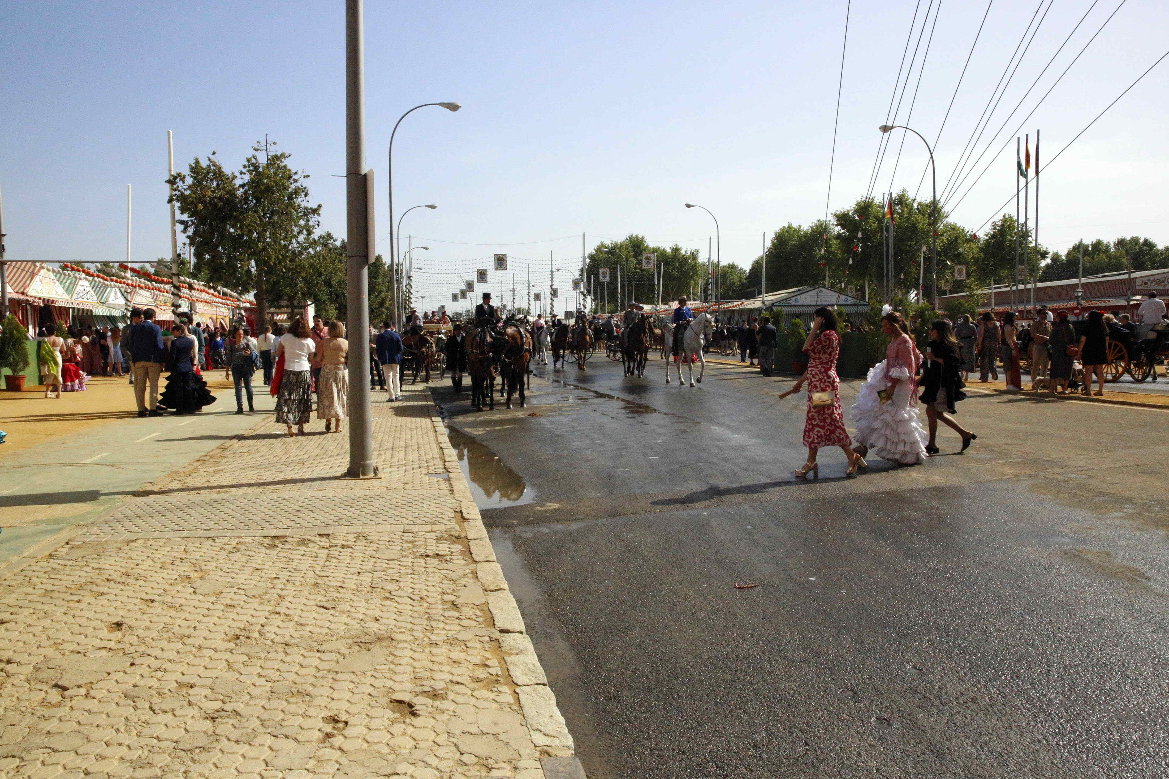 ここまで、楽しい話、美しいものの話をしてきたが、ここの雰囲気を紹介するためには、どうしても伝えなければならないことがある。上の写真のように散水車がときどき水を撒いていたが、理由があった。実は、会場に入ってすぐ、臭いに敏感な私は「臭(くさ)い」と感じたのだ。それは馬が会場のあちこちで排泄する「アレ」のためである。その「アレ」の乾燥した部分が粉となり空中に舞って、皆一部を吸い込んでいるわけであった。人間は物事を五感で感じたままに記憶するというが、今でも私は美しい衣装とともに「アレ」の臭いを一緒に思い出してしまう。これを少しでも防ごうと、散水車が水を撒いているのである。ただ、「臭い」には「慣れ」がつきもので、そのうち気にならなくなった。しかし、より大きな「被害」を受けた。せっかくの新品の革靴だったが、できるだけ踏まないように気を付けていたものの、道路の濡れていたところを通らざるを得なかったため、「アレ」が少し靴の裏にこびりつき、ホテルに帰ってからバスルームで真っ先に洗うことになった。また、穿いていったズボンの裾がうっすらと黄土色になっていた(長く歩いて付いた土埃かもしれなかったが)。ズボンやワイシャツは袋に入れて密封したが、ジャケットや帽子は替えを持ってこなかったので、着続けていくと、この後の旅程で他人から「臭い」と思われないか心配になった(幸いそのようなことにはならなかった)。今後、この祭りに行く方々は、この点を覚悟してほしい。そんな困難もあり、かなり会場内を歩いて(というより会場まで歩いてきたので)、足が痛くなり、1時間くらいの滞在で引き上げることにした。会場入口近くで運よくタクシー乗り場を見つけると、長い列は出来ているものの、次々とタクシーがやって来ているのが分った。それで10分くらい並んで待っていると、少し前の方にいた男性たちが、私に「ハポン?」と言って来たので、「ハポン」と答えると、何と順番を譲ってくれた。そのような親切もあり、無事タクシーに乗れて、まだ会場に向かう馬車も多く走っている車道を通って無事ホテルに帰れたのだった。ちなみに、このフェリアの最中、この会場よりかなり遠くの、例えばセビーリャ大聖堂のあたりでも、観光客を馬車に乗せる商売がやられていたので、「馬の落とし物」にはセビーリャの街中のあちこちで気を付けなければならなかった。