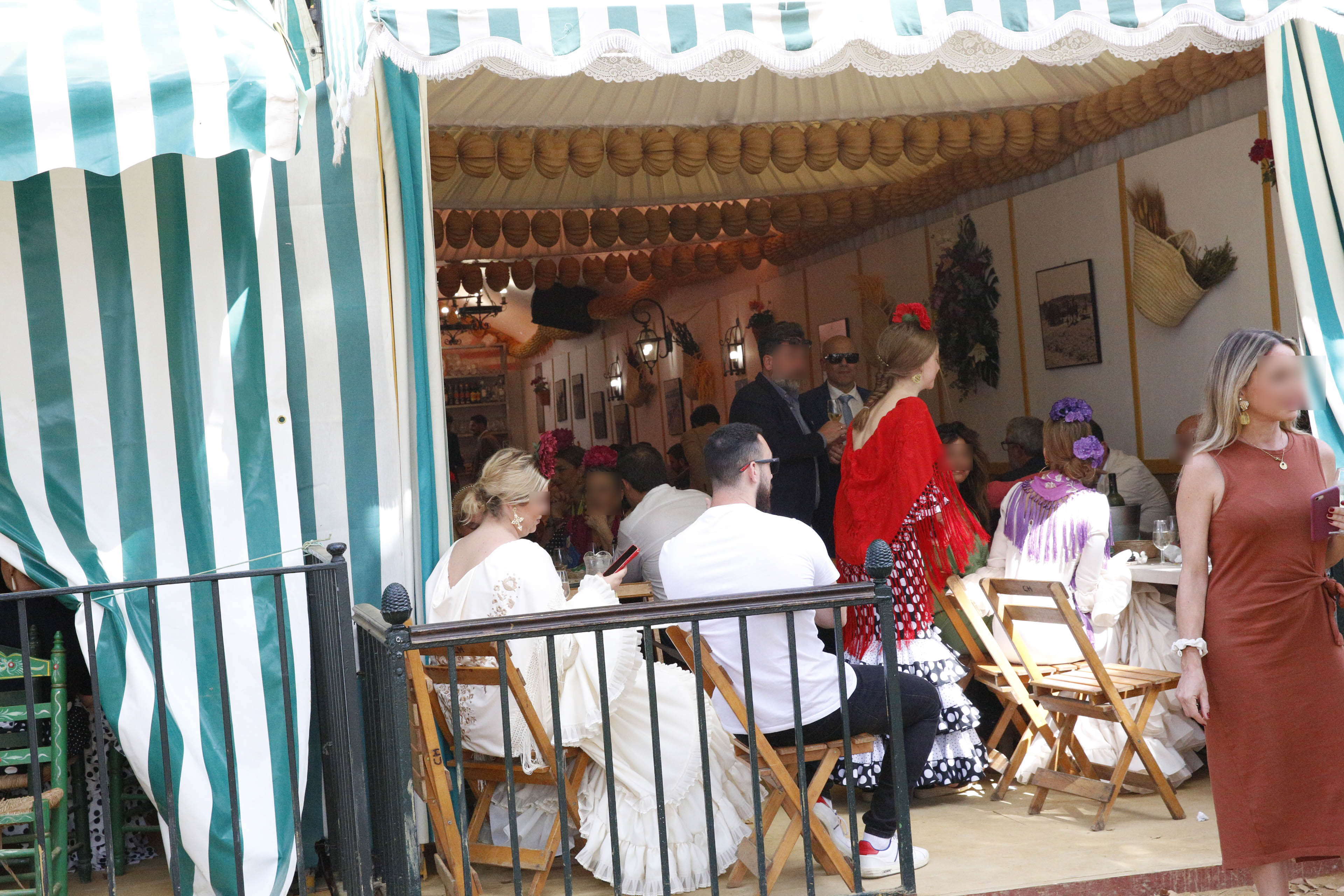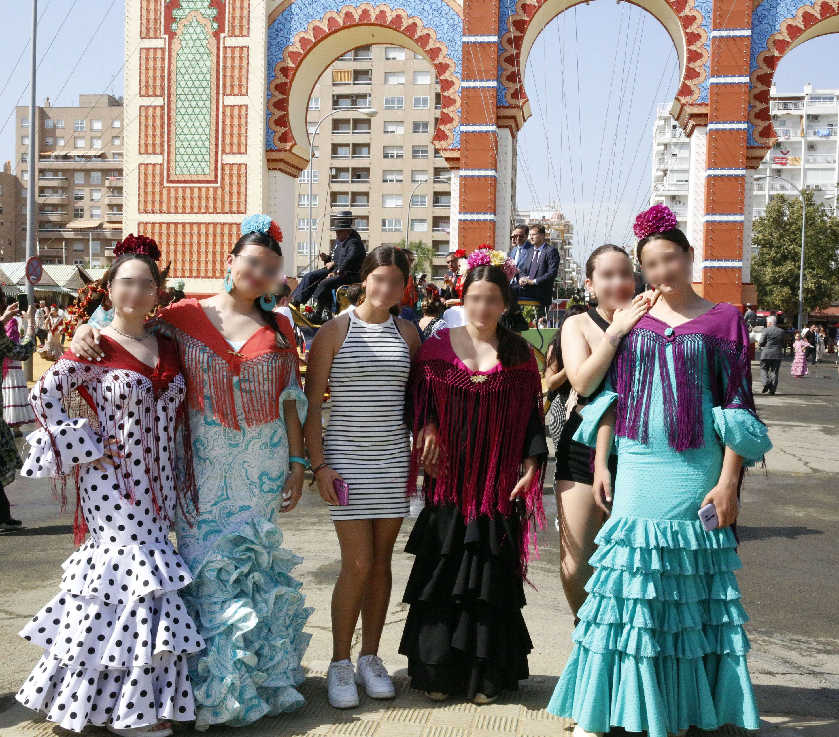 Feria de abril de Sevilla(フェリア・デ・アブリル・デ・セヴィーリャ)といういわゆる「セビーリャの春祭り」があり、そこに参加する女性たちは、皆フラメンカ(またはフラメンコ衣装)という民族衣装を着て参加するというので、「民族衣装おたく」の私は前々からどうしても行きたかった。2024年4月、たいへんな円安で厳しかったが、ついに夢を叶えた。この祭りでは、現地に並ぶ1,000を超える「カセタ」という仮設テントには、その中の人の招待が無いと入れないし、誰もが入れるカセタはあるがその数は限られており、込んでいるため、集団のツアーが組みにくく、そのためこの祭りに参加する日本の旅行会社主催ツアーはかなり少ないようである。したがって、参加したことのある人は他の祭りに比べて多くなく、私が閉口した「あること」にはネットで触れられていないようだ。4月18日の午後4時ころから1時間ばかり参加した報告をしたい。当日の昼前に、セビーリャ旧市街のホテルに着き、チェックイン時間までそのロビーで時間をつぶしていたが、ホテルの前を数回、着飾った女性たちを乗せた馬車が通り過ぎるのが見られ、私は心が踊った。![]()