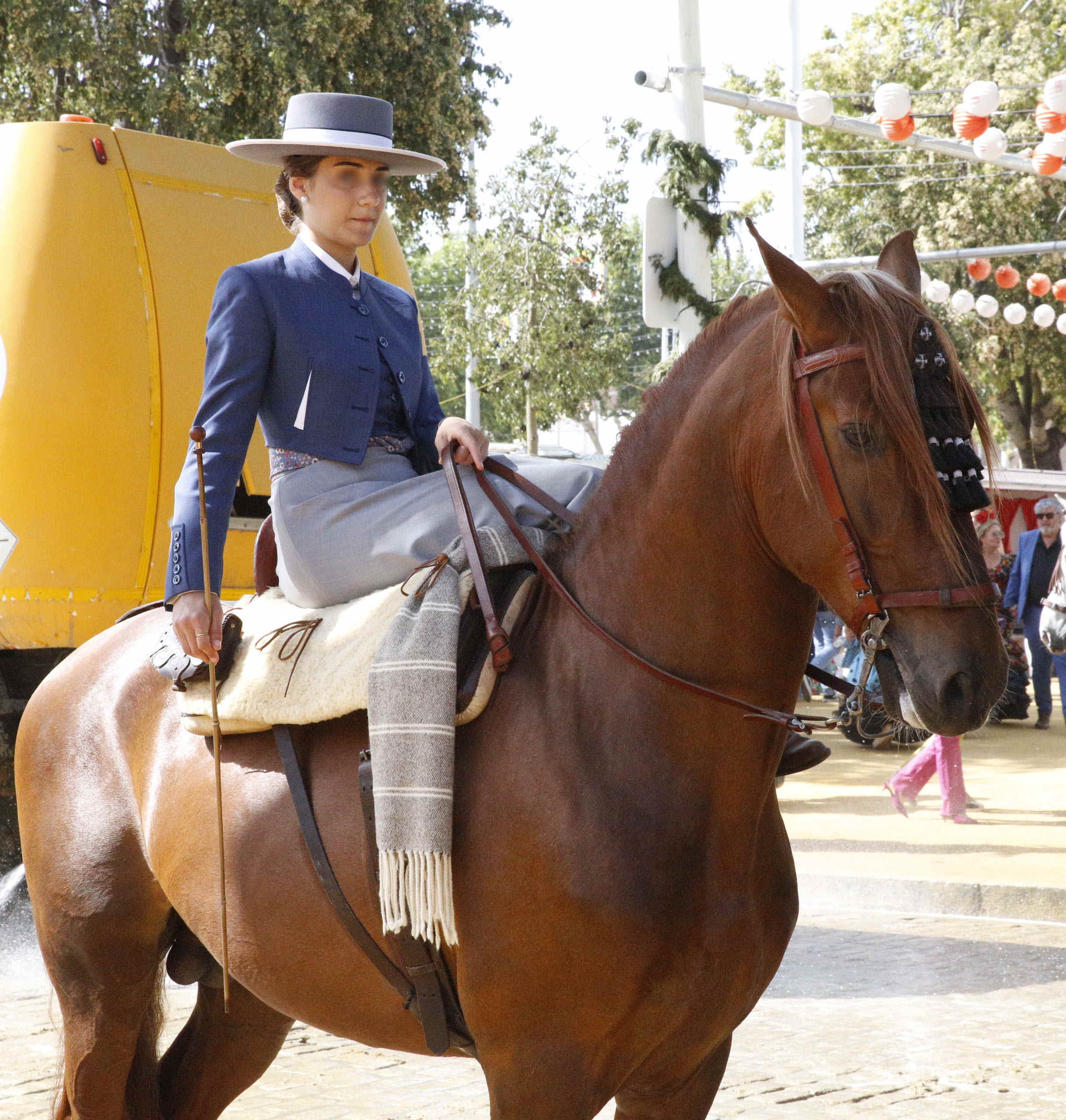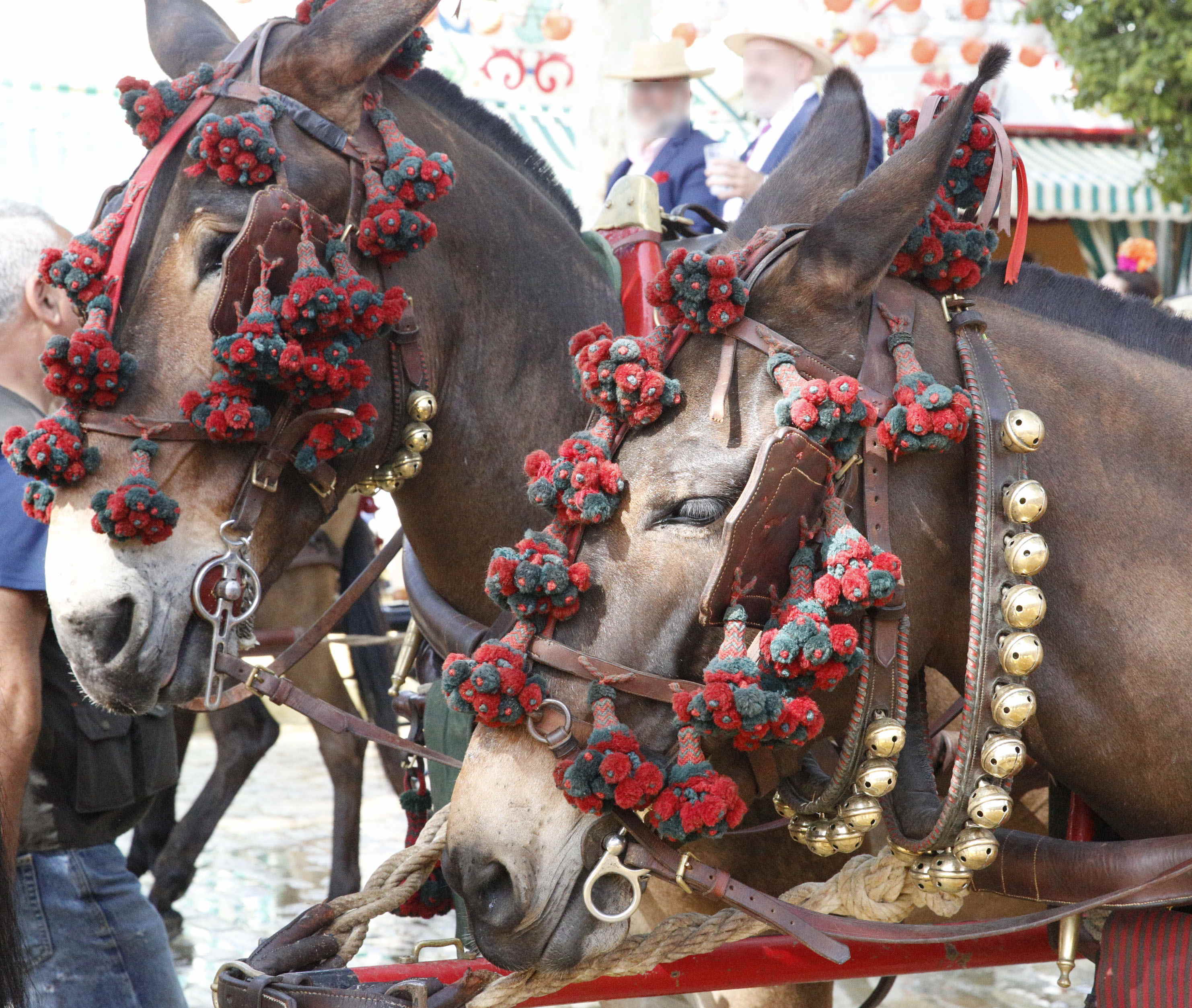 そして、ついにフェリアの入口の門に達した。私は入ってすぐ右手にあった「Info」に行き、会場全体の地図をもらい、その中に多数の黄色で示された多くのカセタに混じって、青や緑色で示された5~6箇所のカセタが「公共のカセタ」であり、誰でも入れることを確認した。また、心配していたトイレが各カセタの中にあることも分って安心した。余裕が出てきて、通りかかったちょっと年配の女性たちの乗っている馬車にレンズを向け手を振ると、彼女たちは喜んで歓声をあげて手を振り返してくれた。この入口近くには馬車が次々とやって来ては停まり、女性たちは降りるが、馬はその場に繋がれたまま放置されていた。また、けっこう会場の奥まで入っていく馬車もあった。
