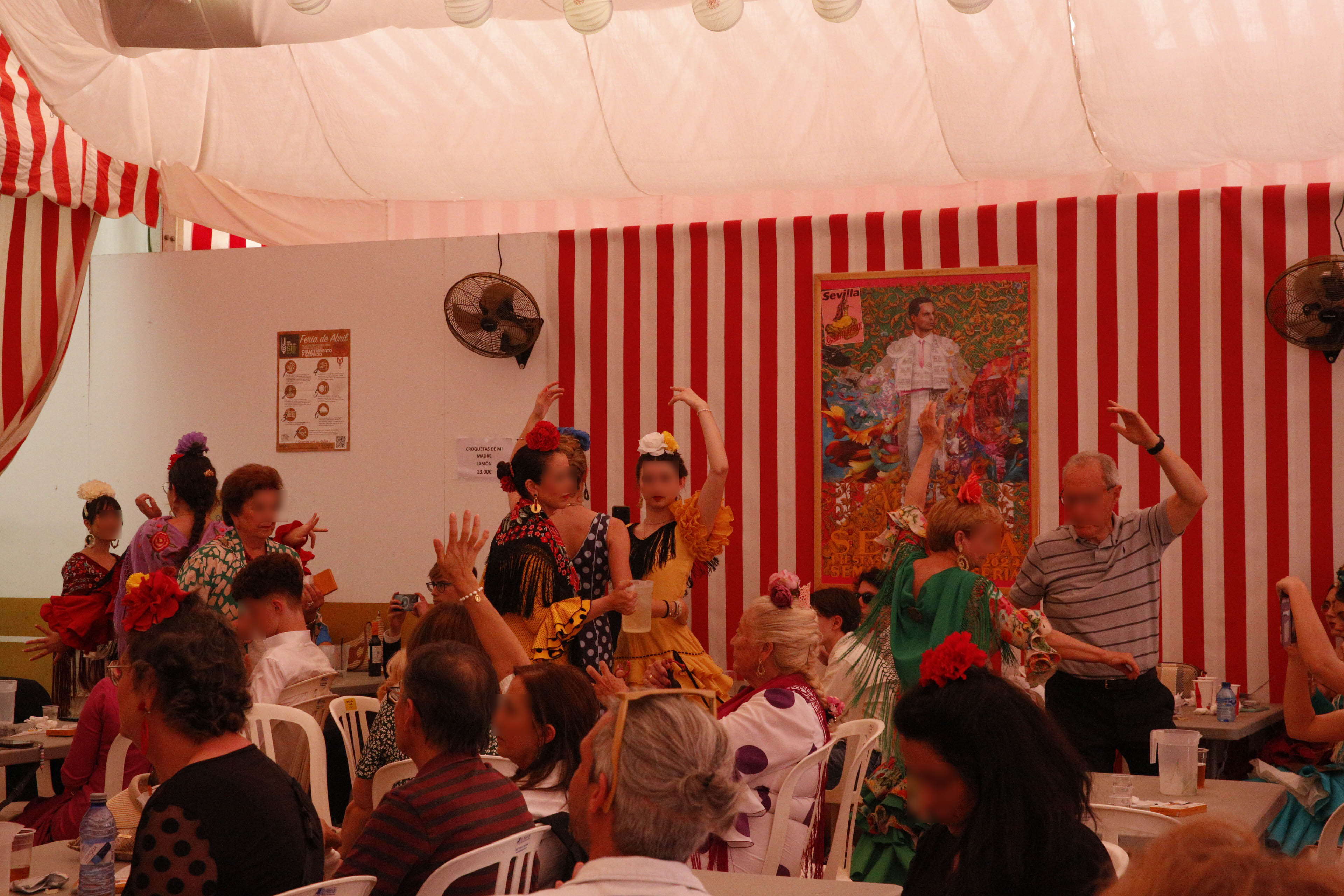 皆が踊っているのは、フラメンコの要素に通じるものがある、というアンダルシアの民族舞踊の「Sevillanas(セビジャーナス)」というものだそうである。写真を背景にした小さなステージのようなものもしつらえてあった。