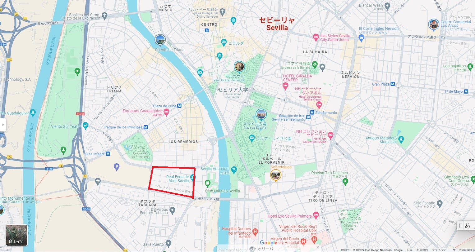 会場は、下の地図に示すところで、この祭りを毎年開催するための場所として、普段からずっと空けられている。ここに、主として復活祭の後の約2週間後の火曜から日曜(2024年は14日の月曜~20日の日曜だったが)にかけての6日間(したがって、だいたい4月から5月のどこかになる)、特定のグループごとのカセタが設置され、人々は着飾って、飲んだり食べたり踊って過ごすのである。それも毎日深夜までという。Wikipediaの説明によると、これは1847年から始まった家畜の見本市に起源をもち、次第にその見本市の色彩が薄れ、今日のような春の到来を喜び楽しむ祭りとなったとのこと。上の写真のように馬車で来たり、馬に乗って来るのは「ブルジョア階級の人々がスペイン各地から馬や馬車で訪れていたことの名残り」だという。