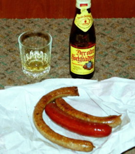本場フランクフルトのソーセージ。後ろは名物リンゴ酒。
