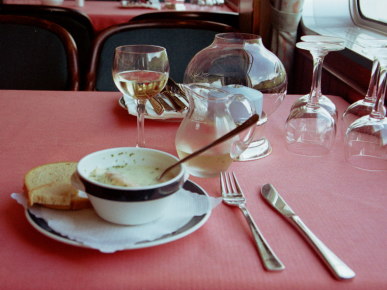 ライン下りの遊覧船内のレストランでポタージュスープとともに飲んだ白ワイン