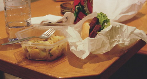 ケルン駅のスタンドで食べた、メンチカツ状のものをはさんだパンと、ジャガイモ・ベーコン炒め。おいしかった