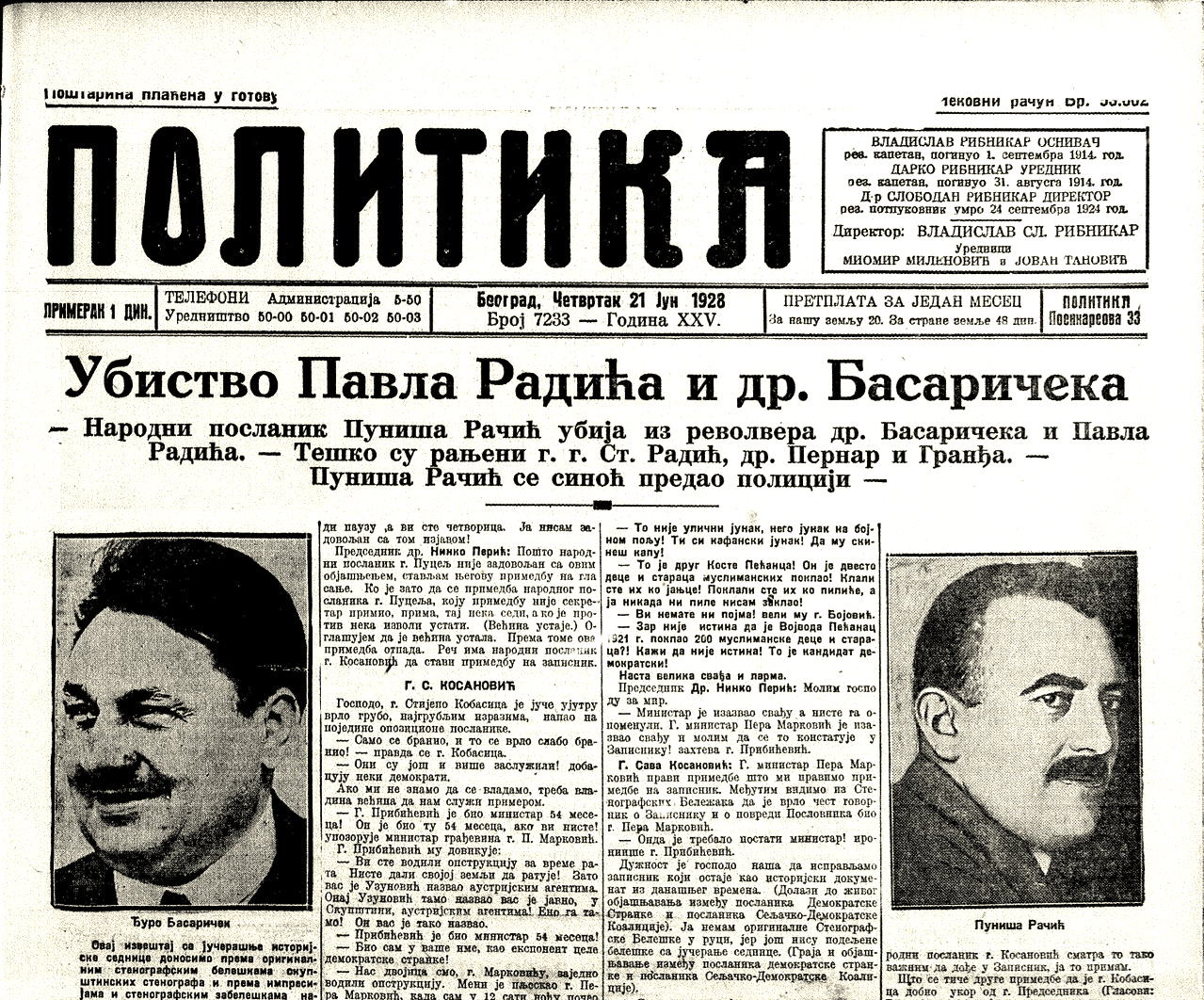 翌日のセルビア日刊紙『Politika』の一面と見られるものの一部を下に示すが、見出しには「Убиство Павла Радића и др. Басаричека (訳:パヴレ・ラディチとバサリチェク博士の殺害)」、副見出しには「— Народни посланик Пуниша Рачић убија из револвера др. Басаричека и Павла Радића. — Тешко су рањени г. г. Ст. Радић, др.Пернар и Гранћа. — Пуниша Рачић се силоћпредао полицији —(訳:— 国民議会議員プニシャ・ラチッチがリボルバーでバサリチェク博士とパヴレ・ラディチを殺害。 — スチェパン・ラディチ、ペルナル博士、グランチャ氏が重傷。 — プニシャ・ラチッチは警察に拘束された)」とあり、パヴレ・ラディチとバサリチェクが殺されたこと、あと3人が重傷を負ったことがここから分かる⑫。さらに、この重傷を負った中の1人、スチェパン・ラディチも入院して後に死亡した⑬。ラチッチは、その後警察に出頭し、懲役60年の判決を受けるが、後20年に減刑されたが後釈放された。⑭ ベオグラードで自宅軟禁に近い待遇となったが、1944年、第二次大戦中にパルチザンに殺されたというがその点は未確認である。