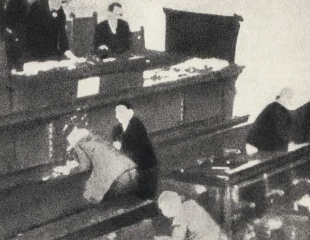 上は凶行の現場。中央左で俯せに倒れているのは、座席などの推定からスチェパン・ラデッチの可能性がある。写真は、1928年に撮影されたとされる歴史的記録画像である。撮影者は不明であり、著作権の有無を断定できないが、撮影から70年以上が経過しているため、著作権は消滅している可能性が高い。 教育目的で提示するにあたり、制度的誠実性を保ちつつ、出典不明・著作権不明として保留的に扱う。もし著作権者または関係者からの申し出があれば、速やかに対応・削除する。