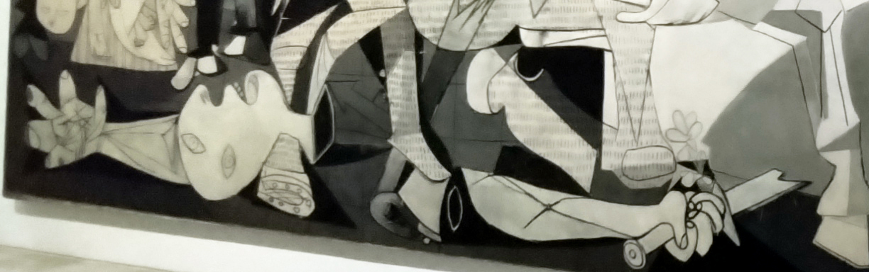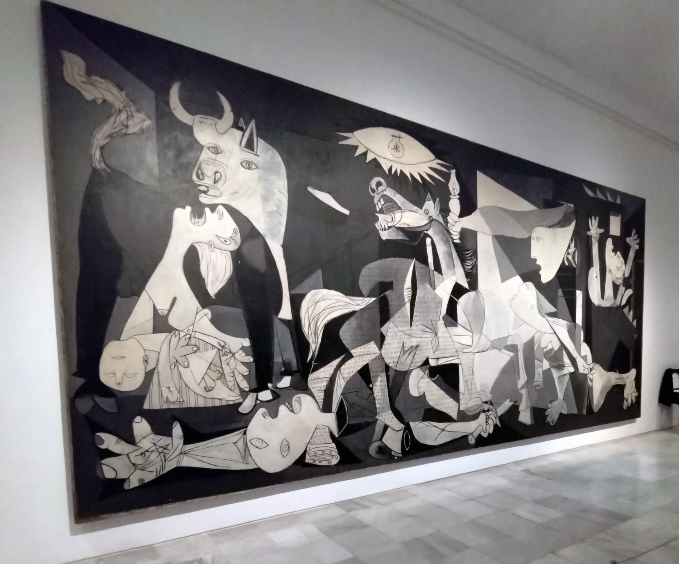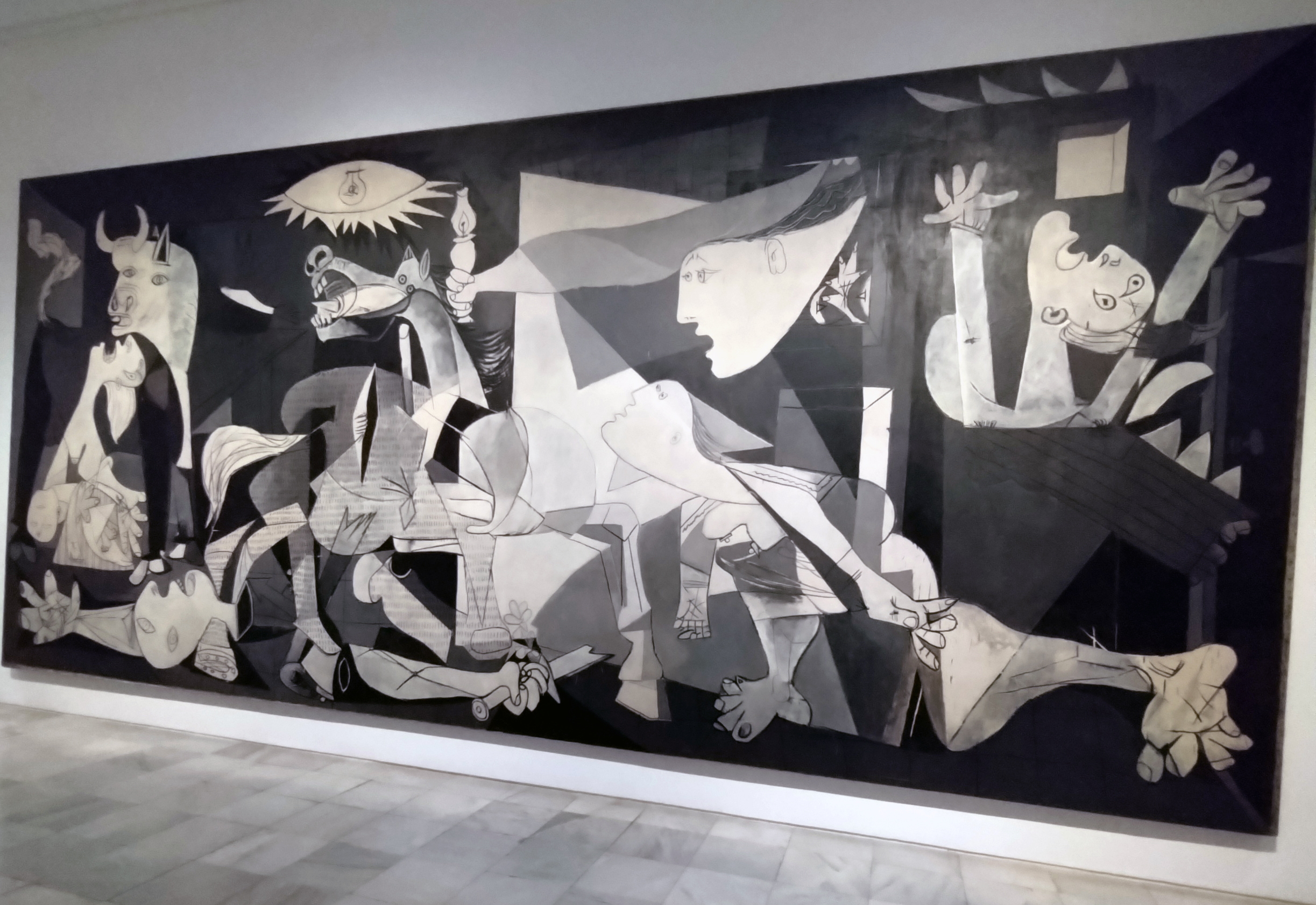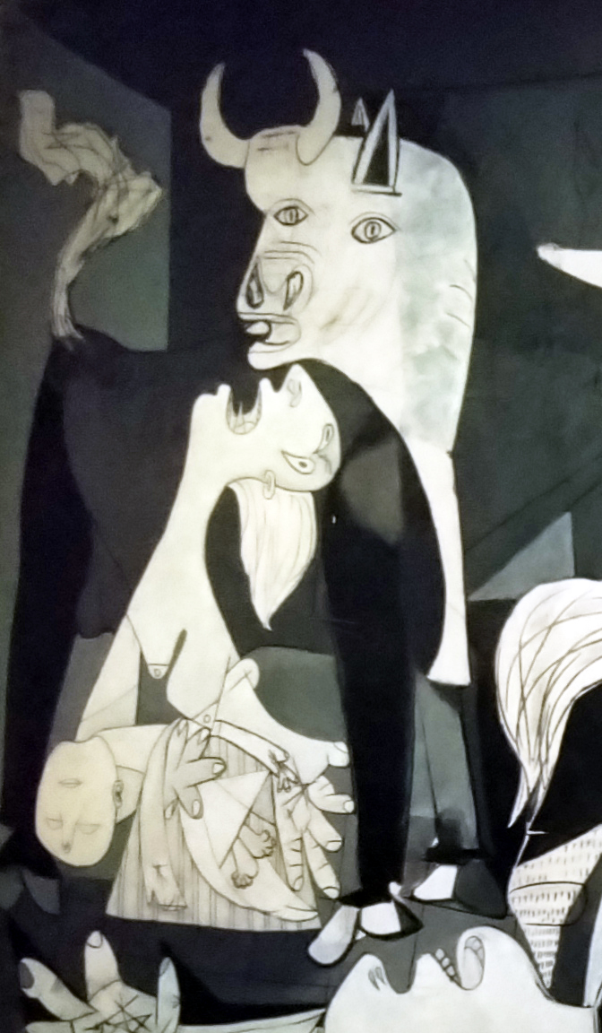 ゲルニカの絵とは1937年4月26日、ドイツ空軍が、当時起きていたスペイン内戦(選挙で成立した左派の「人民戦線」政府に対し、右派勢力が起こした反乱軍との内戦)に対し、右派勢力に加担してスペイン北部のゲルニカという町を航空機による無差別爆撃、市民の大量殺傷をした。これに対し、憤ったピカソが1937年のパリ万博のスペイン館に展示するためパリで描いた絵のこと。縦3.493m、横7.766mという大作。ピカソは母国スペインに寄贈するつもりだったが、内戦で反乱軍が勝利し、フランコ将軍の独裁国家になったため、この後ニューヨーク近代美術館で保管され、1975年にフランコが死んでスペインが民主化への道に踏み出したので、1981年マドリッドのプラド美術館に渡り、その後1992年現在のソフィア王妃芸術センターに移った。