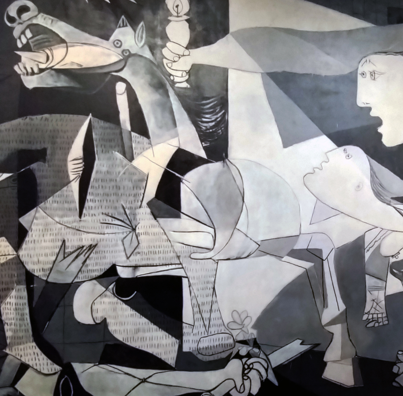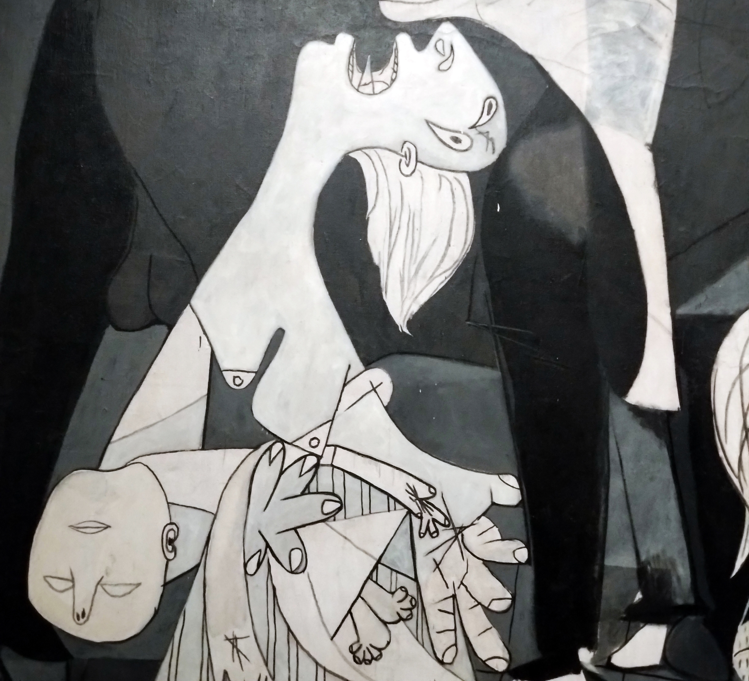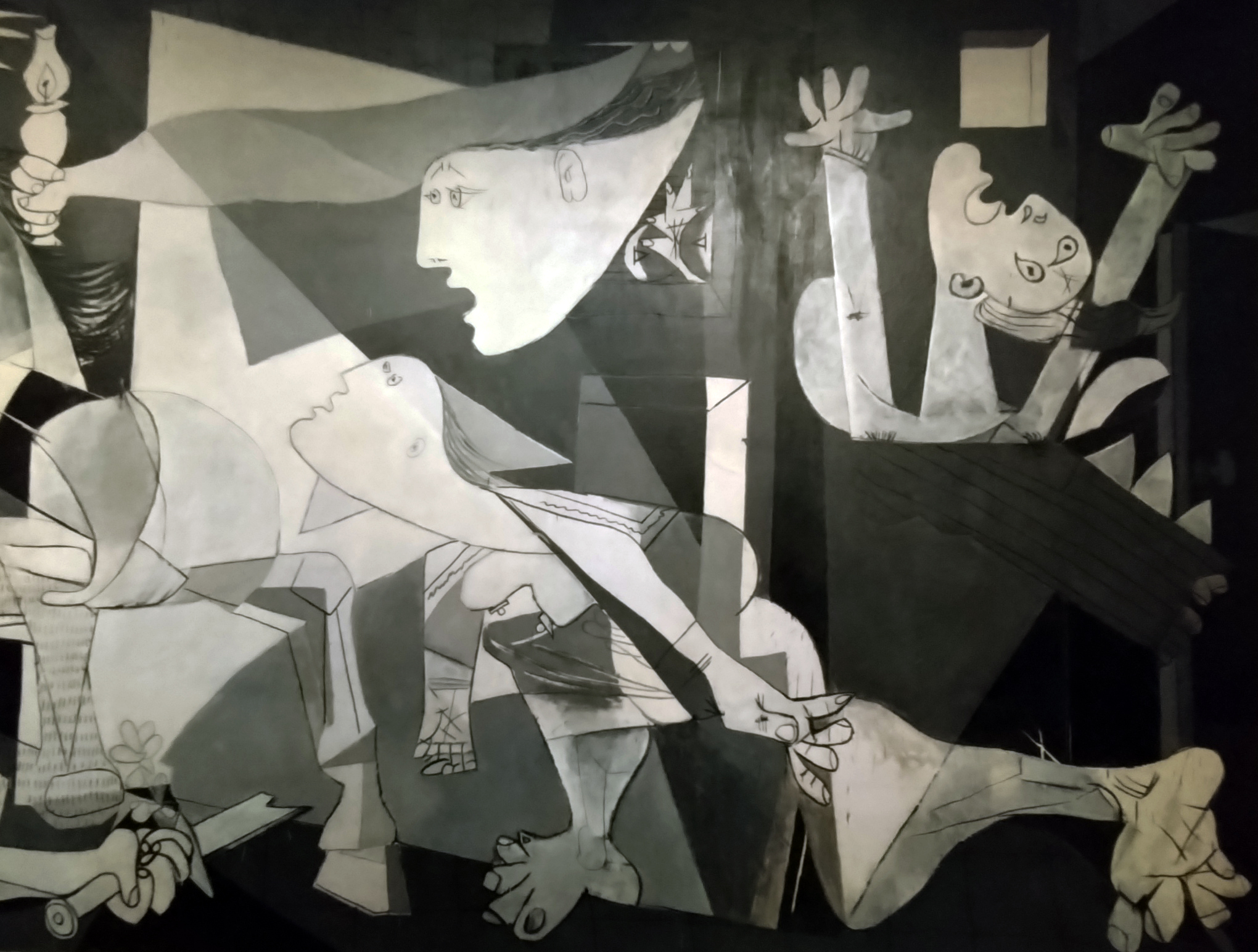 ゲルニカの絵とは1937年4月26日、ドイツ空軍が、当時起きていたスペイン内戦(選挙で成立した左派の「人民戦線」政府に対し、右派勢力が起こした反乱軍との内戦)に対し、右派勢力に加担してスペイン北部のゲルニカという町を航空機による無差別爆撃、市民の大量殺傷をした。これに対し、憤ったピカソが1937年のパリ万博のスペイン館に展示するためパリで描いた絵のこと。縦3.493m、横7.766mという大作。ピカソは母国スペインに寄贈するつもりだったが、内戦で反乱軍が勝利し、フランコ将軍の独裁国家になったため、この後ニューヨーク近代美術館で保管され、1975年にフランコが死んでスペインが民主化への道に踏み出したので、1981年マドリッドのプラド美術館に渡り、その後1992年現在のソフィア王妃芸術センターに移った。