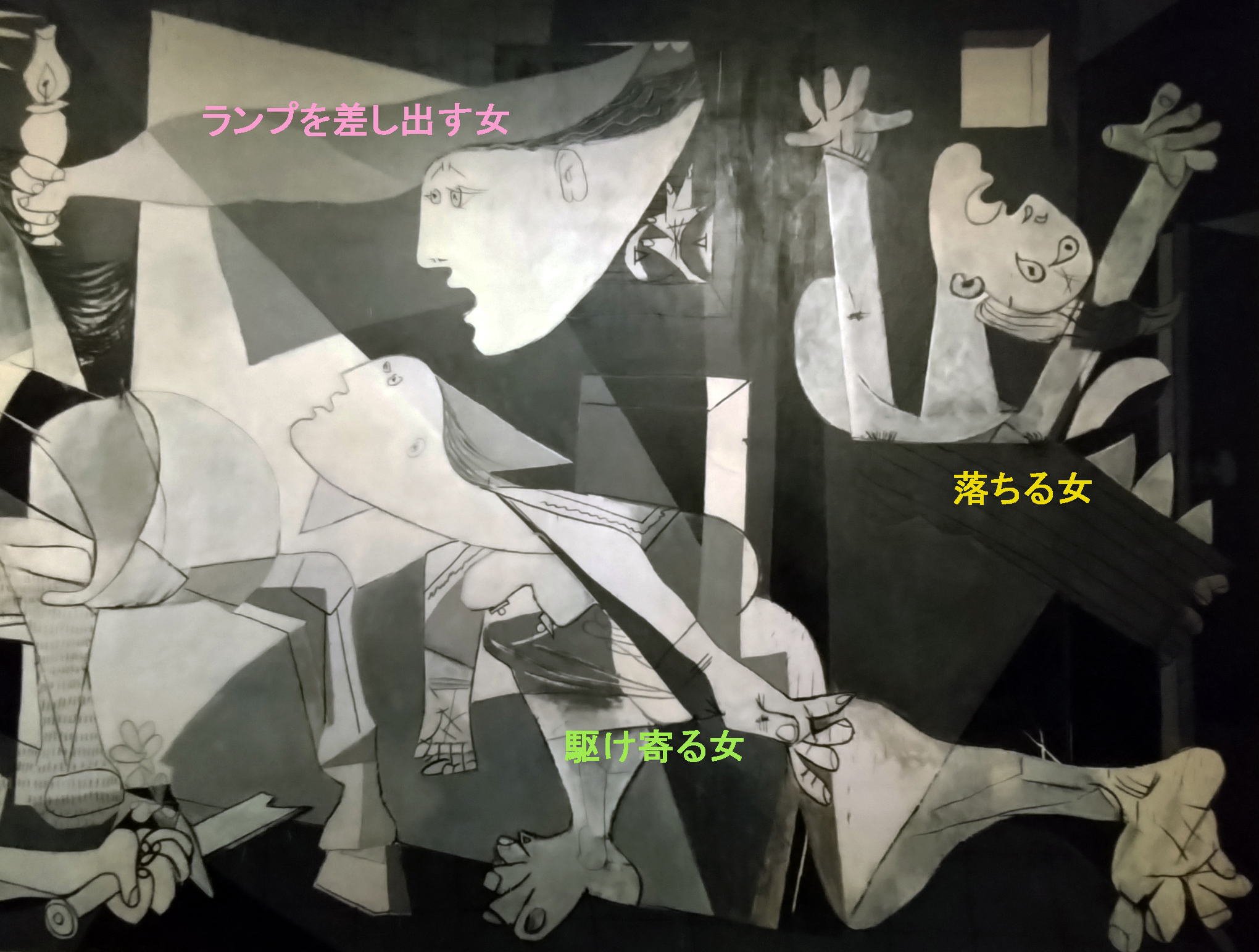 一番右手の両手をあげて叫んでいる女は、一般に「落下する女」と言われている。空襲により火の粉を浴びて建物から落ちていく犠牲者である。