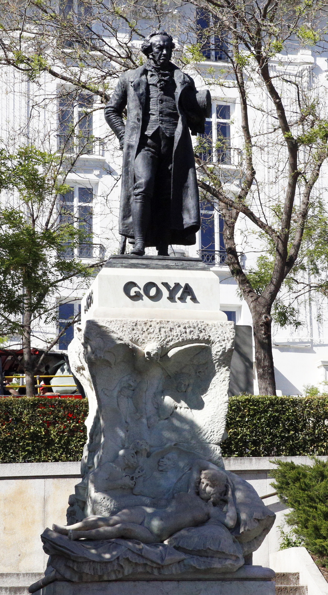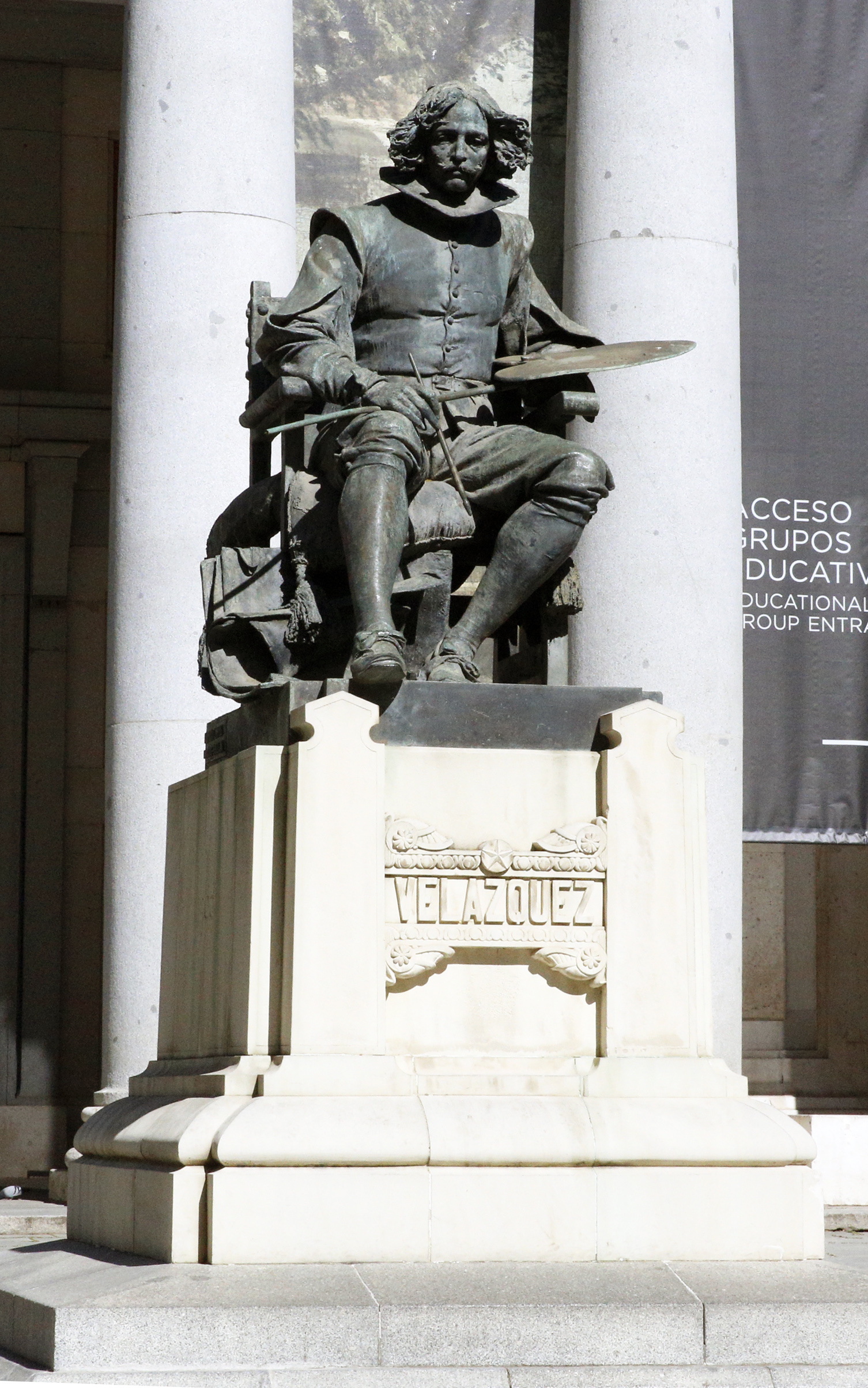 美術館近くのベラスケス像(左)。ゴヤ像(右)。ゴヤ像の下にマハがいるのが分りますか?