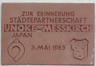 メスキルヒの概観と、公園に掲示されていた姉妹都市のプレート。