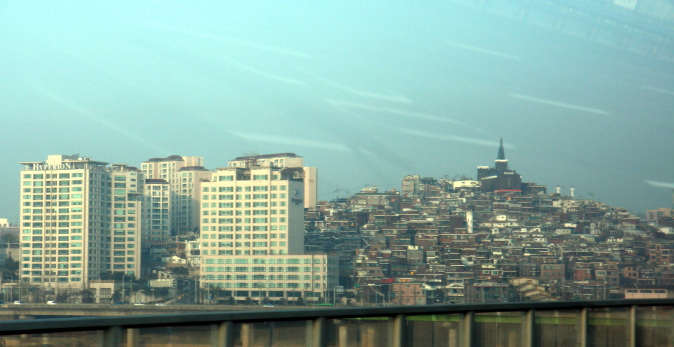 ソウル市内。地震がないのでどんどん山の斜面に家やアパートを建てていった。車内からの撮影で、お見苦しいのはご容赦を。私の個人ガイドは、「35年ガイドをやっているけどこの間一回も地震というのを体験したことがないねえ」。「日本の建築のプロがソウルで仕事をしたとき『えっ? こんなやわい建て方でお金をもらっていいんですか?』と言った話を聞いた。」