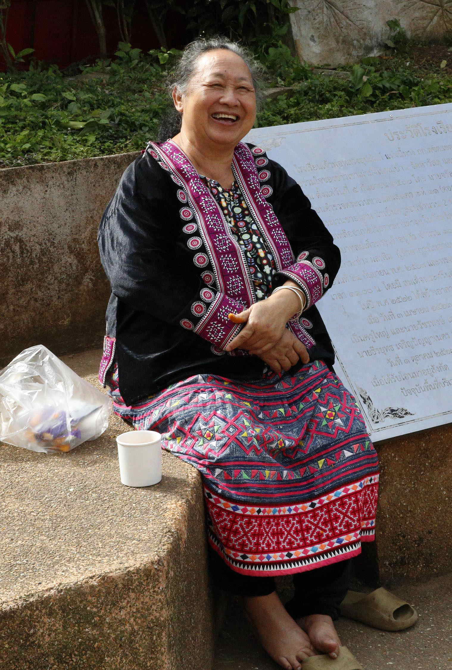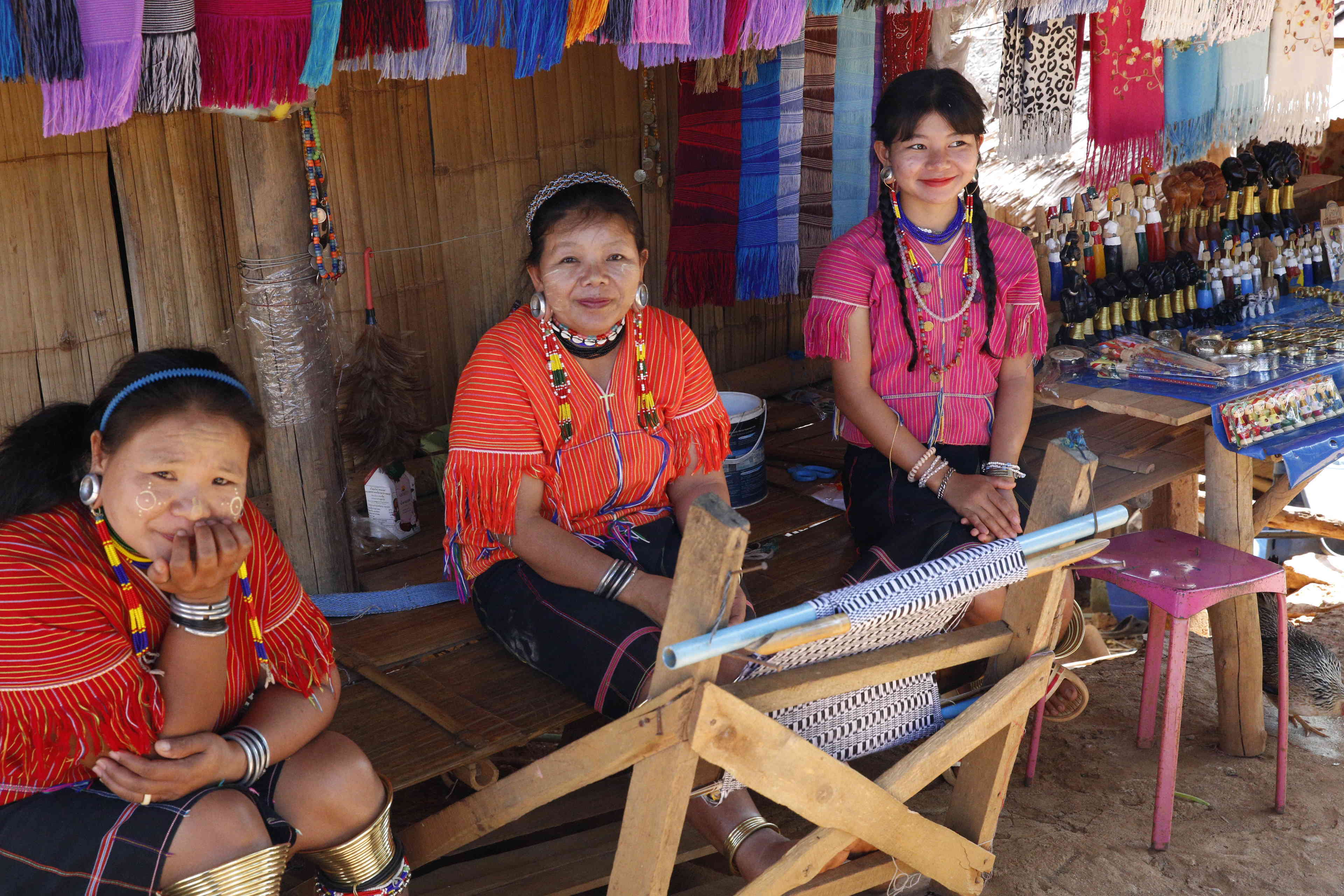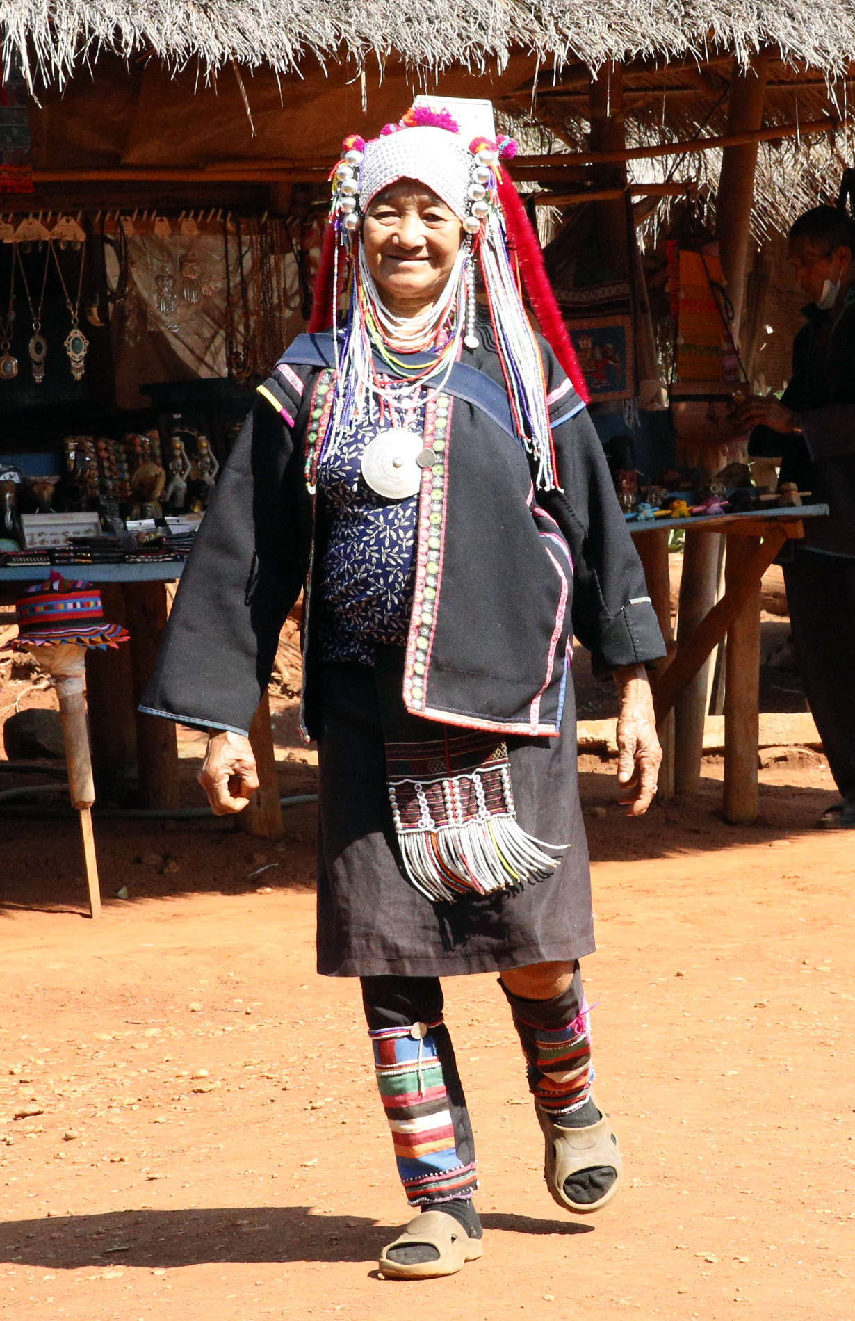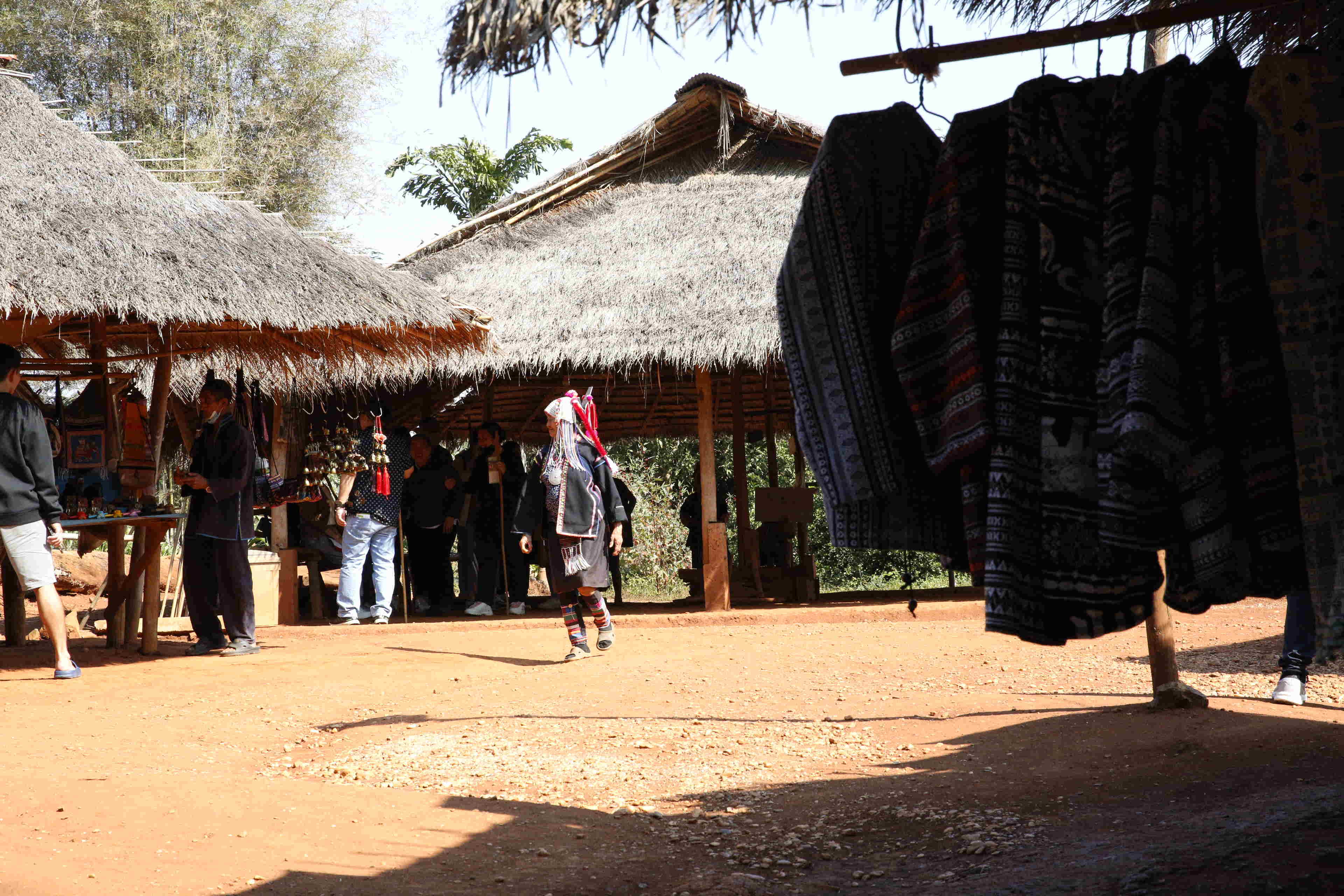 ここは、「エコツーリズムの一環の場所ということで観光地として作られ、5つの山岳少数民族約200名がその文化などを示し、土産物を売っています。他にも、タイには特に「首長族の村」がいくつか観光地としてあります。「簡単に実際に北部に住む少数民族に会いに行けない観光客が少数民族を知ることのできる場所」として評価されている一方、「人間動物園だ」という批判もあり、特にタイの中のいわゆる「首長族」についてはUNHCR(国連難民高等弁務官事務所)からは人権蹂躙として非難されていますが、タイ政府は反論しています。特に「首長族」に対しては、「ミャンマーの戦火を逃れて来た難民で、就労ビザを与えて観光対象として収入を保障している」とか。私は民族衣装にたいへん興味がありますので、好奇心から行ってみました。5つの民族とは、シナ・チベット語族に属す言語を話すアカ族、ラフ族、カレン族の一つカヤウ族、同じくカレン族の一つカヤン族(いわゆる「首長族」)と、ミャオ・ヤオ語族を話すヤオ族です。