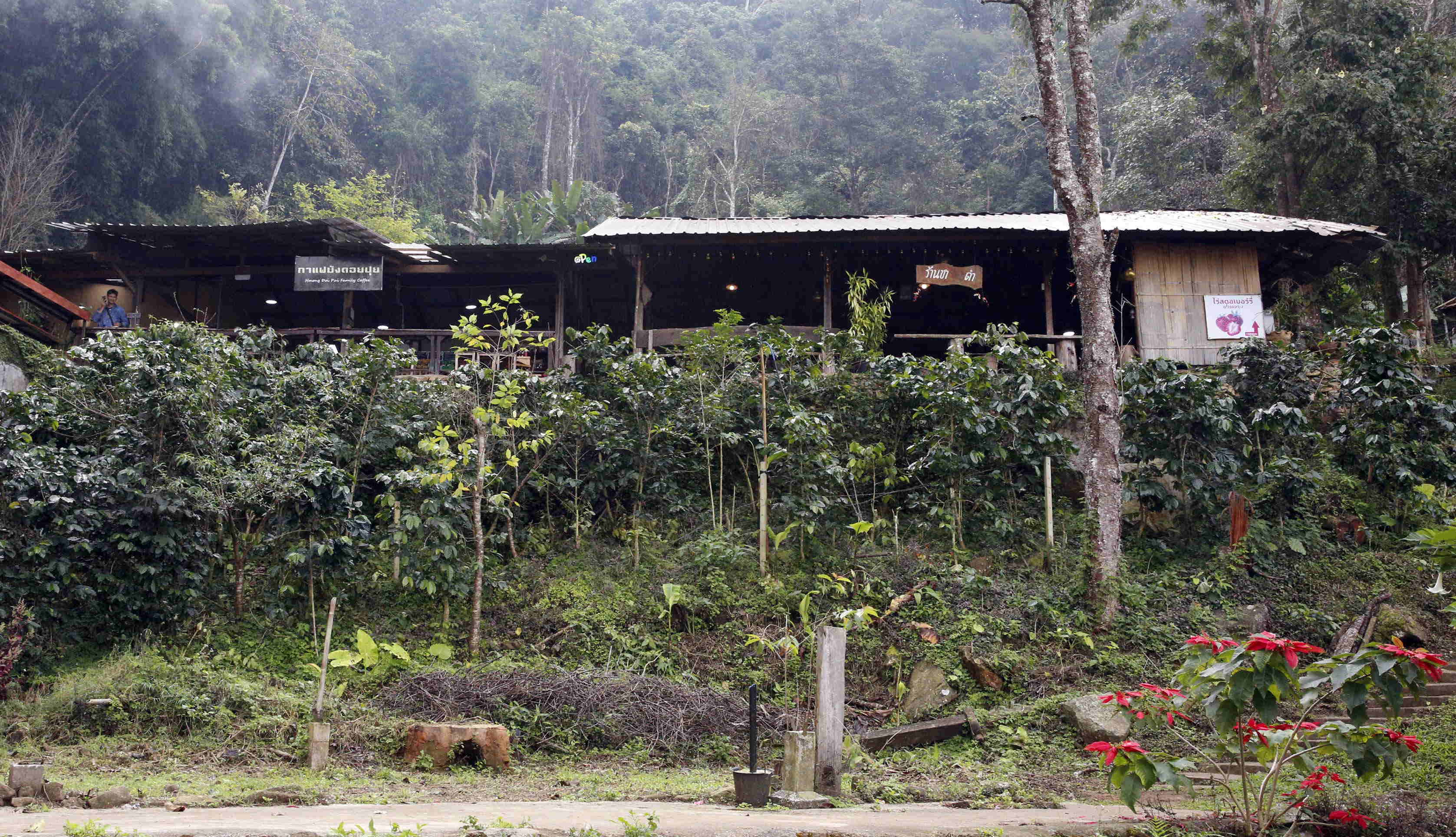 民族衣装の生地や、デザインを取り入れたお土産などを売る店が多く、観光対象として割り切っているようですが、しっかりとした家が立ち並び、実際の村だということはわかります。ラーマ9世の指導を受けて、かつてやっていたケシ栽培を止め、代わりに植えるよう言われたコーヒーや苺の栽培が行われていました。高台にここのコーヒーを使ったカフェもありました。