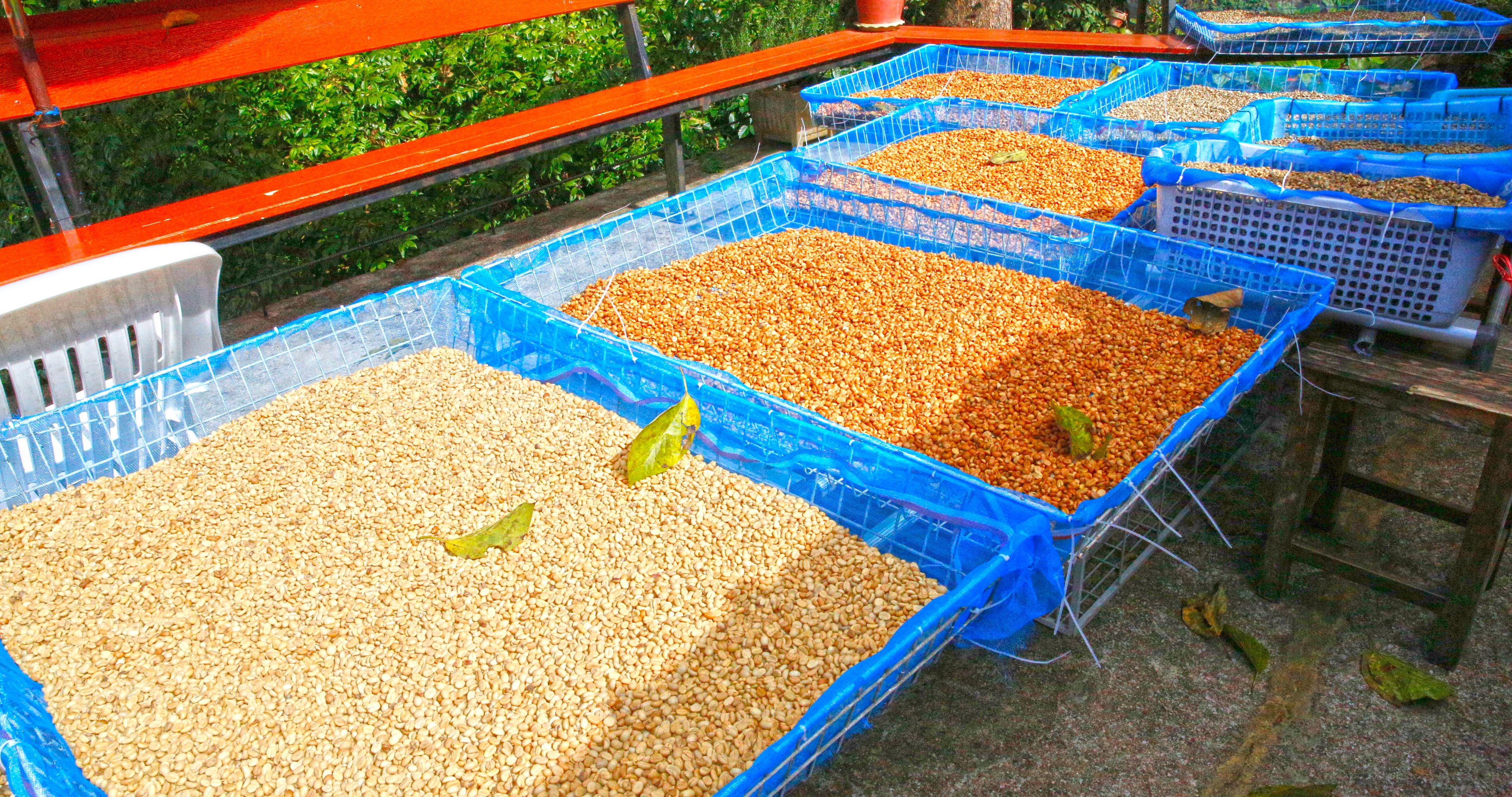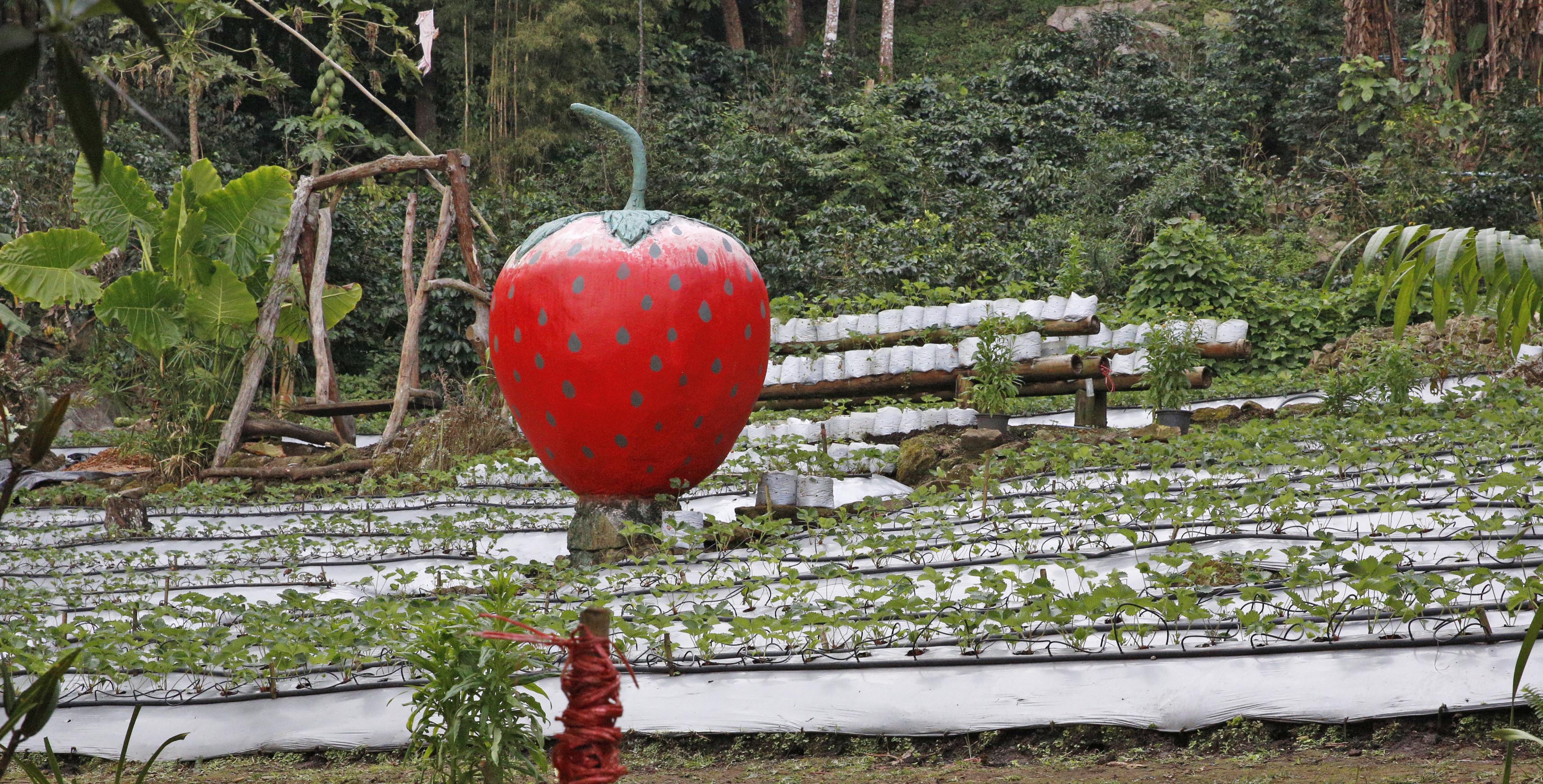 採れたコーヒー豆と苺畑