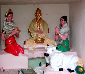 セーナー村のヒンドゥー寺院とややピンク色に見えるスジャータの祠。右は祠の中の供養するスジャータとゴータマの像。