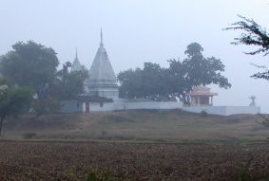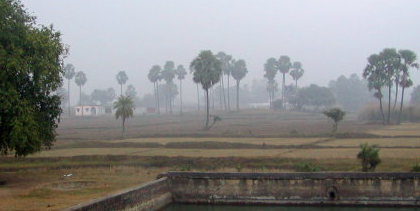 ガイドの説明では、この向こうの林が、ゴータマが苦行した場所の一つといわれているとのこと。セーナー村より望む。