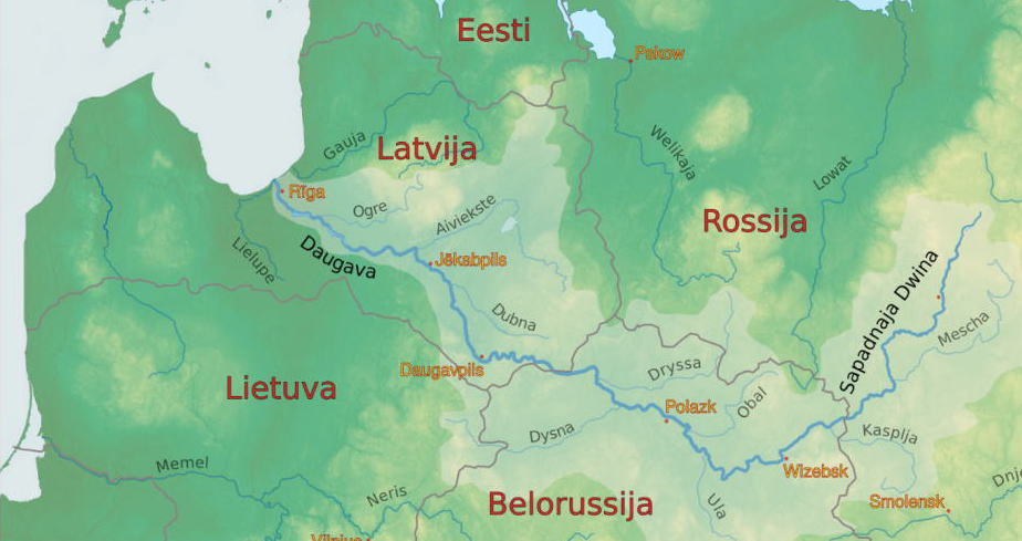 ダウガヴァ川はロシアに水源をもちベラルーシを通ってラトビアに流れ真ん中を通ってリガに至りバルト海に注ぐ。地図はWikipedia「ダウガヴァ川」より