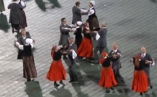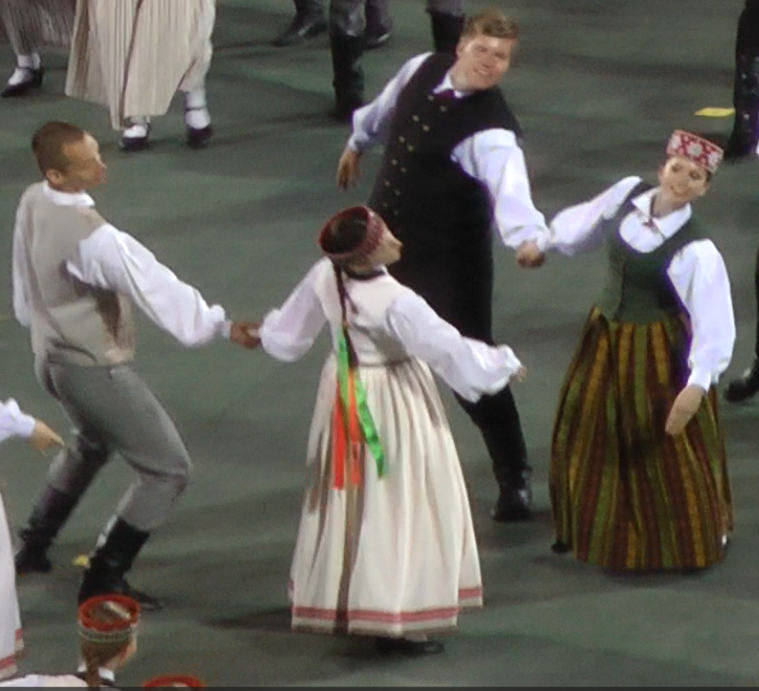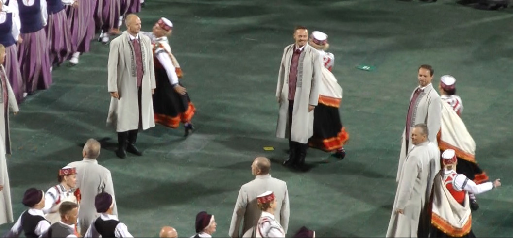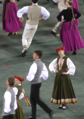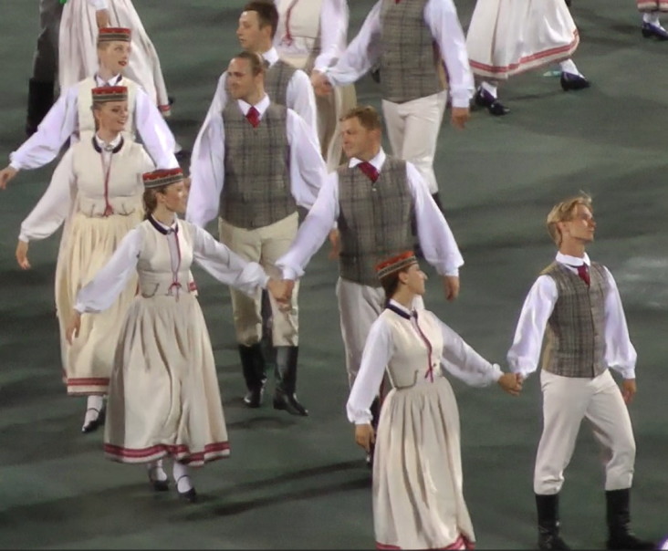 クルゼメ地方の最後はALSUNĢIETIS。題名は「アルスンガ地方の人々」となるだろうか。軽快な曲と踊りである。83組の青年グループが踊った。「このダンスは初めて1994年にTautas deju ansamblī "Rotaļa"で演じられ、1995年の新作ダンスコンテストで1位を獲得しました。このダンスは8組のペアで踊られ、そのインスピレーションは民族舞踊と民謡に基づいています」(Alsunģietis – Dejas zelta fondsより)とのこと。アルスンガ地方とは、クルゼメのバルト海沿岸の中央部に位置するところである。
