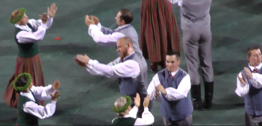 次の「KAS TUR MEŽĀ RĪBĒJA」は、Kas tur mežā rībēja - Kursa (rklic.org) に歌詞が乗っており、Bingの翻訳によると、「森で何が鳴いているの? オークの下で何が隠れているの? それは小さな虫が落ちて その頭を打ったのかもしれません。」というものである。ダンスは、初めゆったりとしたテンポの曲で始まったが、途中ではテンポが一気に早まり、そしてまた元のテンポにもどるという音楽に乗って踊られた。歌詞を反映しているのか、女性が立ち木のようなポーズを取り、男性が腕立て伏せに近い俯せの格好で落ちた「虫」を演じているのだろうか、と思われる場面を作った。また女性も激しくジャンプしたり、さらに驚いたのは男性が女性のウエストを挟んで持ち上げたかと思ったら女性が足を上に向けてバタバタと動かしたりしたこと。改めて、「情熱のラトヴィア」を強烈に見せつけられ、ものすごく印象に残るダンスであった。