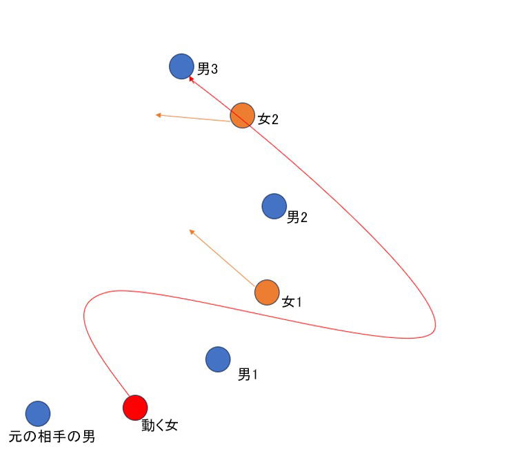 左の図は最初に女性が男1の前を通り、男2の後を通って男3のところに結果として反時計回りに行くことを示している。帰りは男2の前、男1の後を通って、要するに8の字を描くように動く。女1、2もそれぞれ同様に動く。右の写真は女性が男性の後を回っているところ。