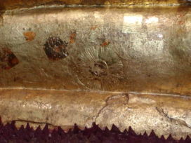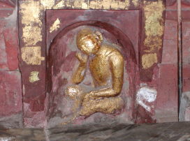 仏像の足には法輪。右は台座に彫られている、入滅を嘆き悲しむアーナンダ。