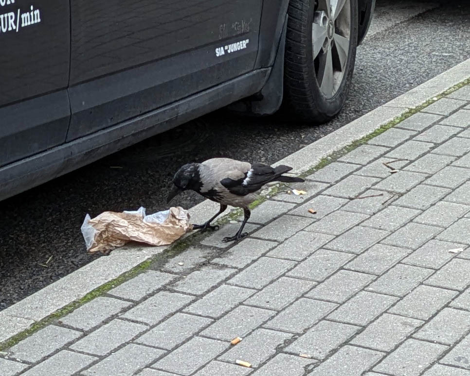 リガの街中でごみを漁るツートンカラーのズキンカラス。スロヴェニアにもよくいました。