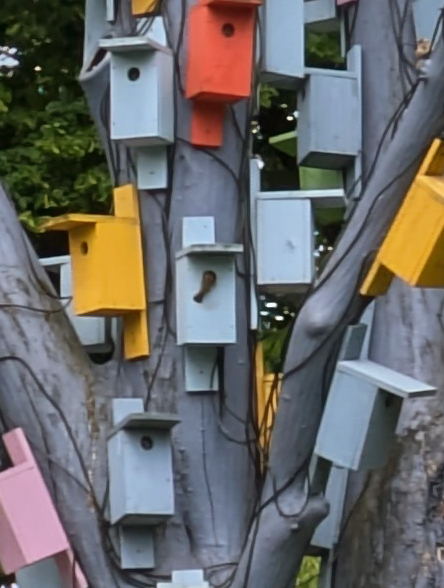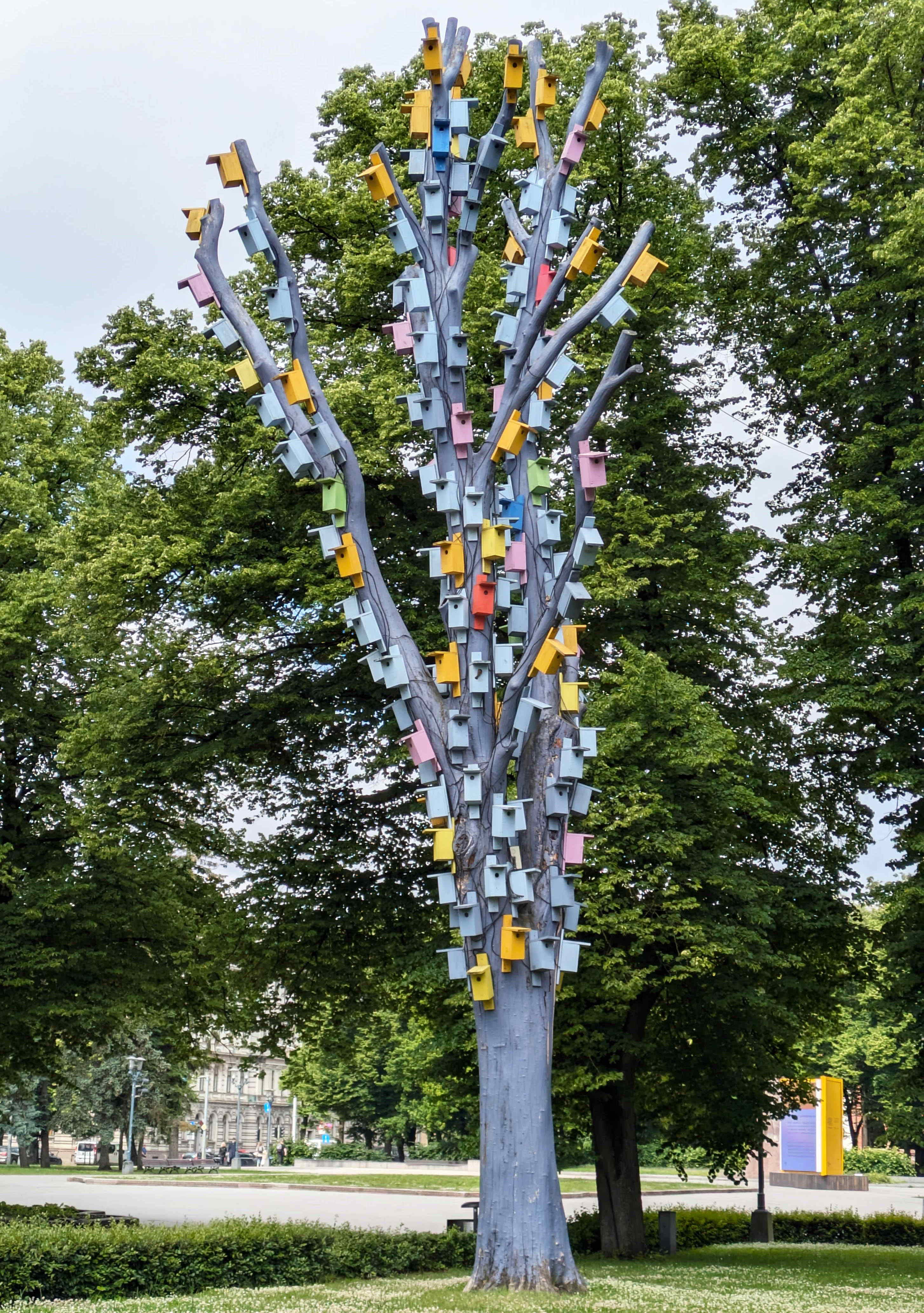 リガの公園の、芸術性と実用性を兼ねた鳥籠群。この中の一つにスズメと思われる鳥が1羽が入ろうとしていますが、どこか分かりますすか?