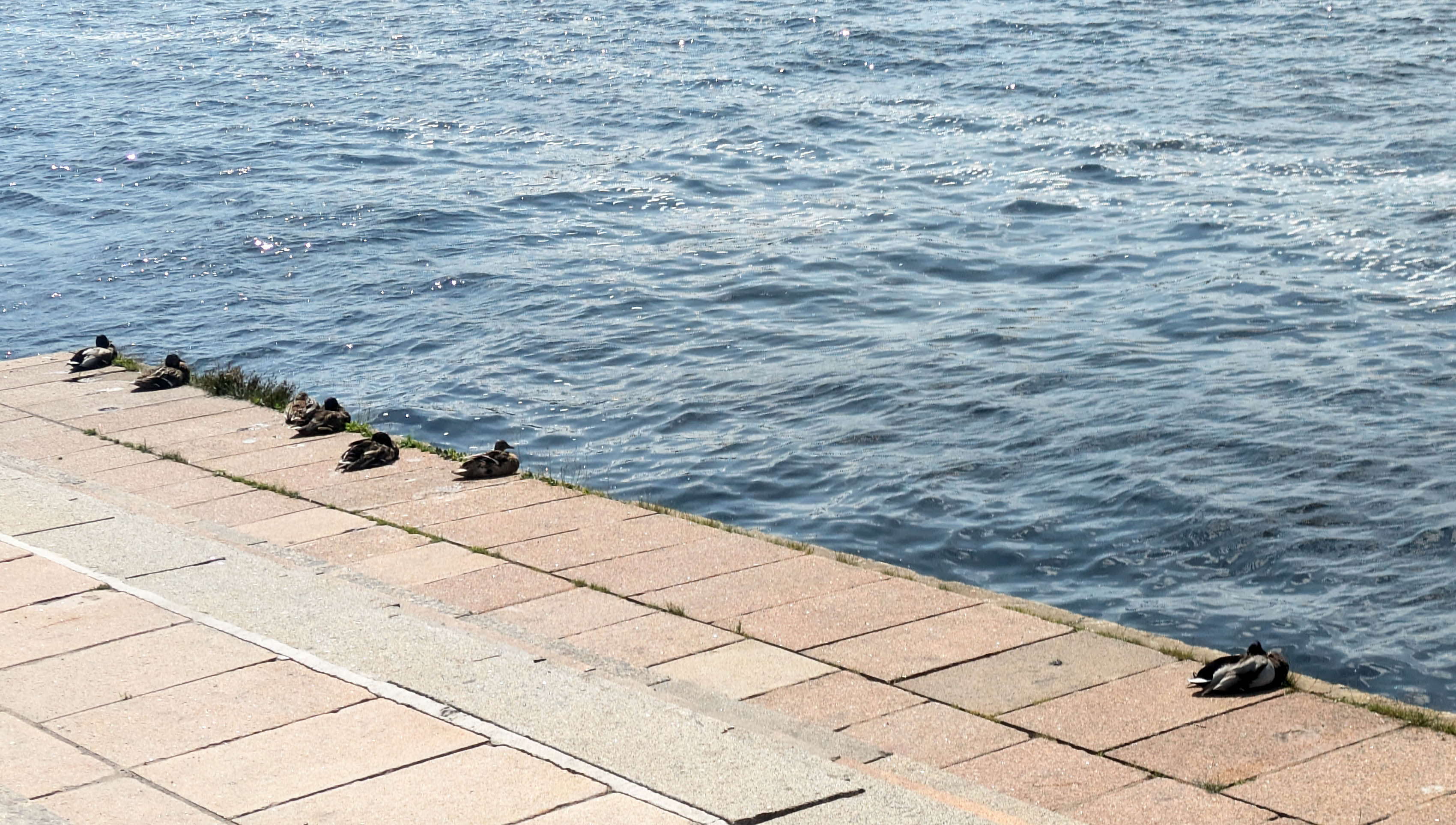 海近くのダウガヴァ川岸で休むカモたち