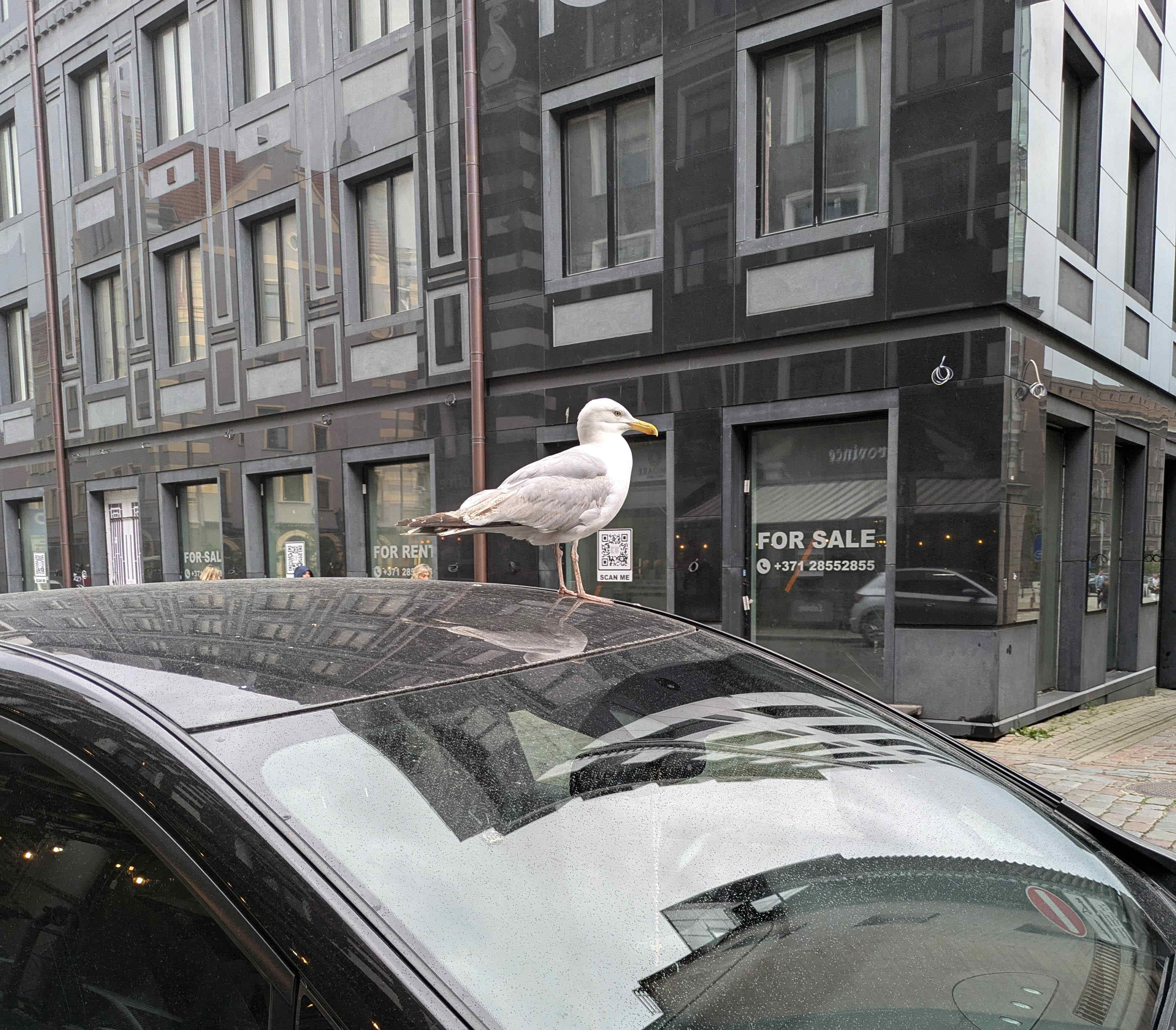 左はリガ駅のホームの、定番のスズメと鳩、そして鳥に詳しい友人の指摘によるとユリカモメ。右はヨーメッパセグロカモメか?。停車していた自動車の上から悠然とリガの街を眺めていました。リガは海に面しているためカモメが街中を闊歩しています。