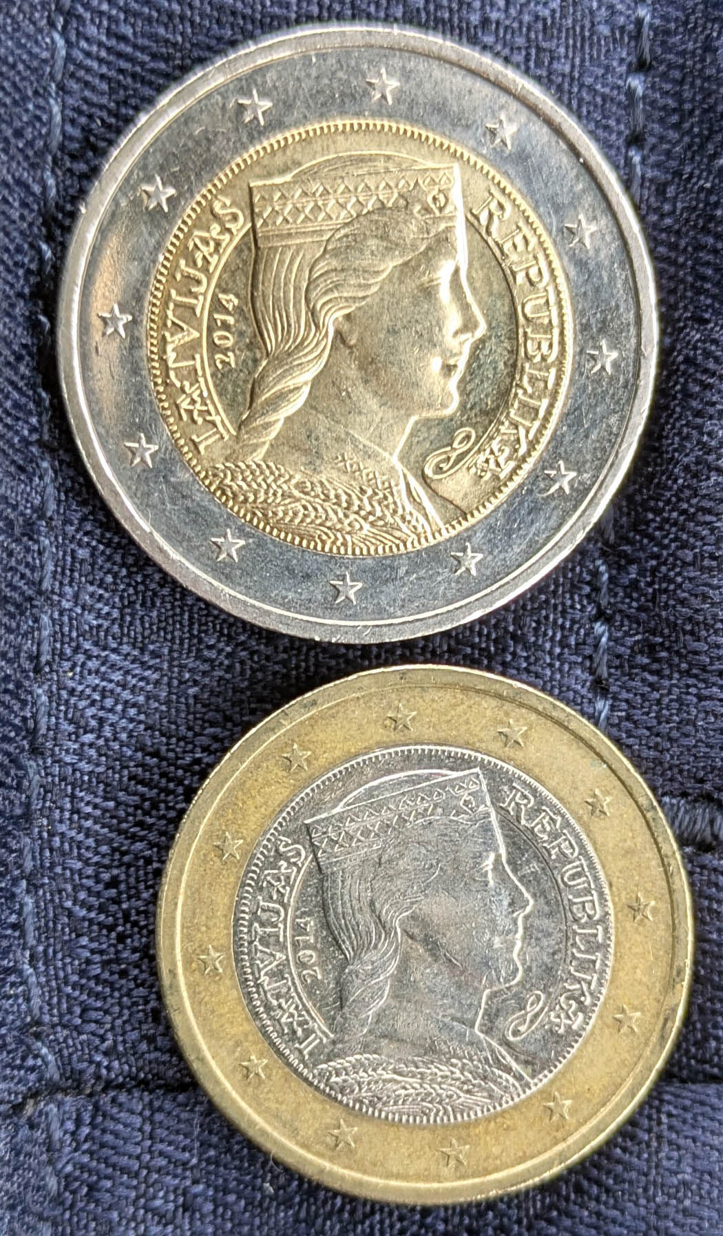 上が2ユーロ、下が1ユーロ硬貨